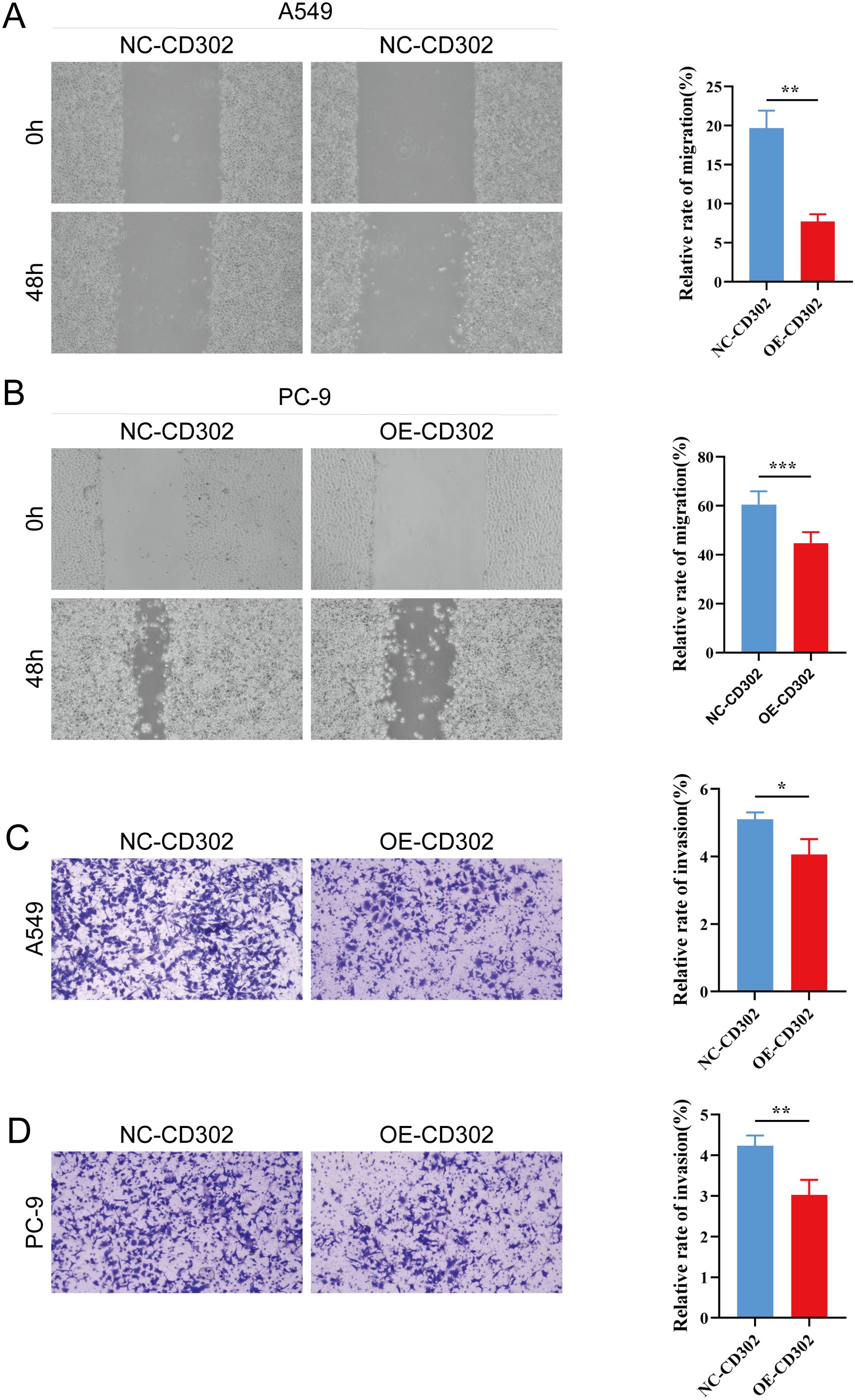 Figure 8. Effects of CD302 on NSCLC cell migration and invasion. (A, B) Scratch wound assay evaluating the effect of CD302 on the migration of A549 and PC-9 cells. (C, D) Transwell assay assessing the impact of CD302 on the invasion of A549 and PC-9 cells. *P<0.05, **P<0.01 and ***P<0.001.