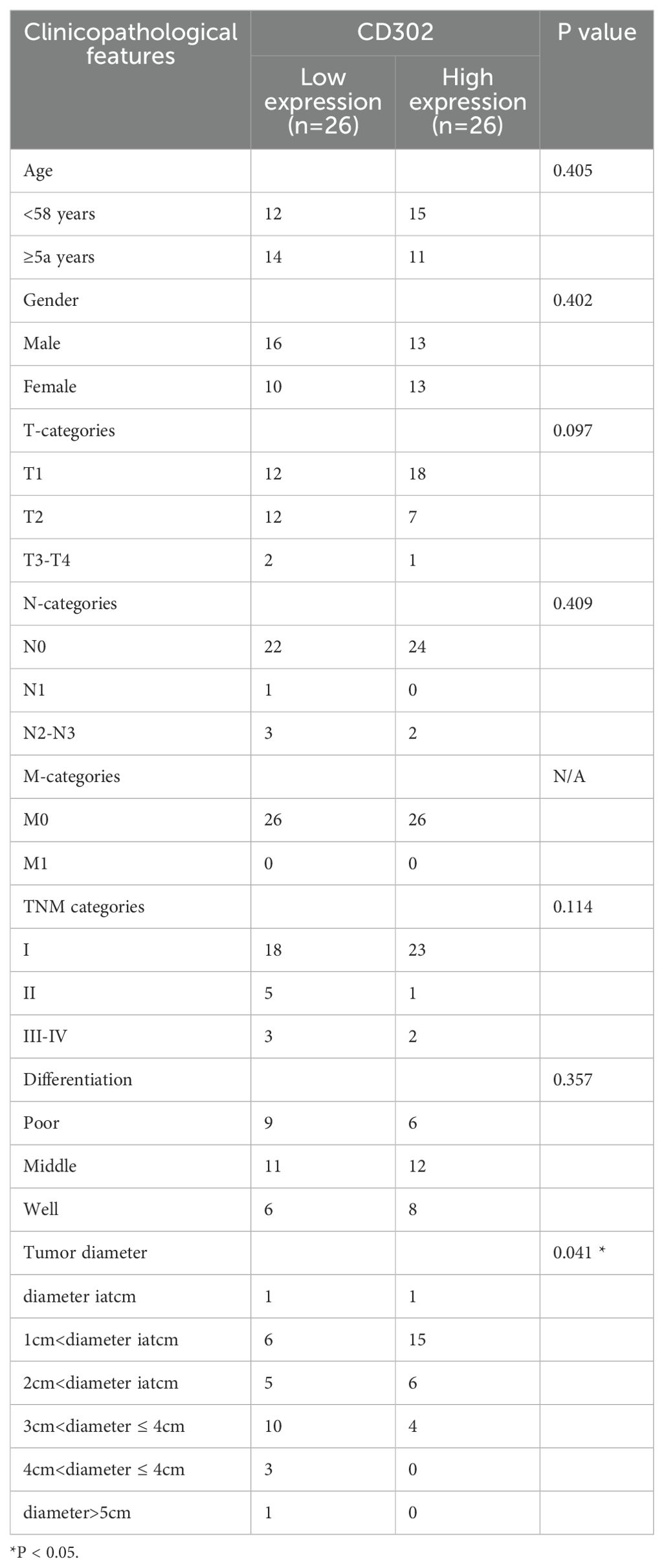 Using the median CD302 expression as a cutoff, the 52 patients were divided into high- and low-expression groups (n = 26 each) to examine associations with clinicopathological parameters. Chi-square tests showed no significant association between CD302 expression level and age (P = 0.405) or sex (P = 0.402). Rank-sum tests indicated no significant relationships between CD302 expression level and T stage (P = 0.097), N stage (P = 0.409), overall TNM stage (P = 0.114), or differentiation (P = 0.357), whereas a significant difference was observed for tumor diameter (P = 0.043). All cases were M0, so M stage could not be assessed statistically. Thus, CD302 expression level was unrelated to age, sex, T stage, N stage, M stage, TNM stage, and differentiation, but was associated with tumor diameter (Table 1).