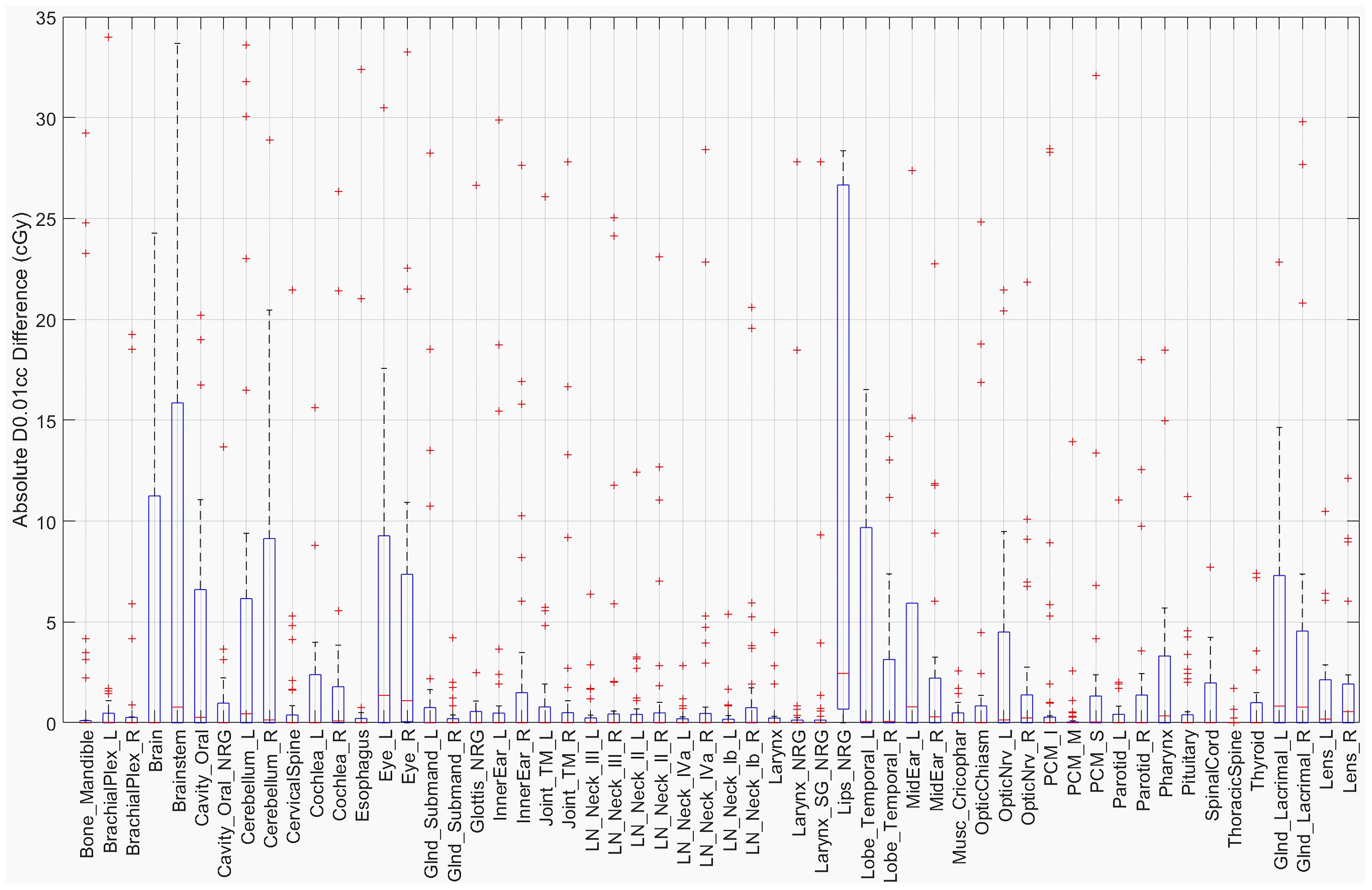 In the context of radiation therapy, anatomical structures guide both target optimization and avoidance during treatment planning. Any changes in segmentation may lead to variations in dose distribution, affecting treatment optimization and evaluation. To assess this, we computed the D0.01cc metric for each structure, defined as the minimum dose received by the hottest 0.01 cc of tissue (approximately 10 mm³). This metric is clinically relevant as it captures localized dose hotspots, which are especially important in small or radiosensitive organs and is sensitive to small segmentation changes.