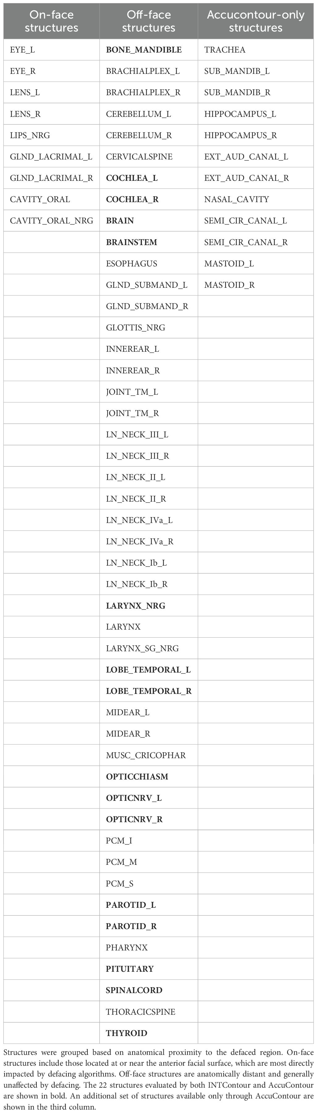 To assess the impact of defacing based on anatomical location, we categorized all structures into on-face and off-face groups according to their proximity to the defaced facial surface. Specifically, on-face structures were defined as superficial structures located within approximately 5 mm of the outer facial surface and thus most likely to be directly affected by defacing (e.g., eyes, lenses, oral cavity). Off-face structures were deeper or posterior and therefore less likely to be modified (e.g., brain, brainstem, spinal cord). Although the oral cavity is partially internal, it frequently overlaps with defaced regions in anterior CT slices and was classified as on-face based on visual confirmation of masking effects. Additionally, we identified which structures were supported by both AI segmentation platforms (INTContour and AccuContour) and which were unique to AccuContour. Table 1 summarizes this classification and platform availability across all evaluated structures.