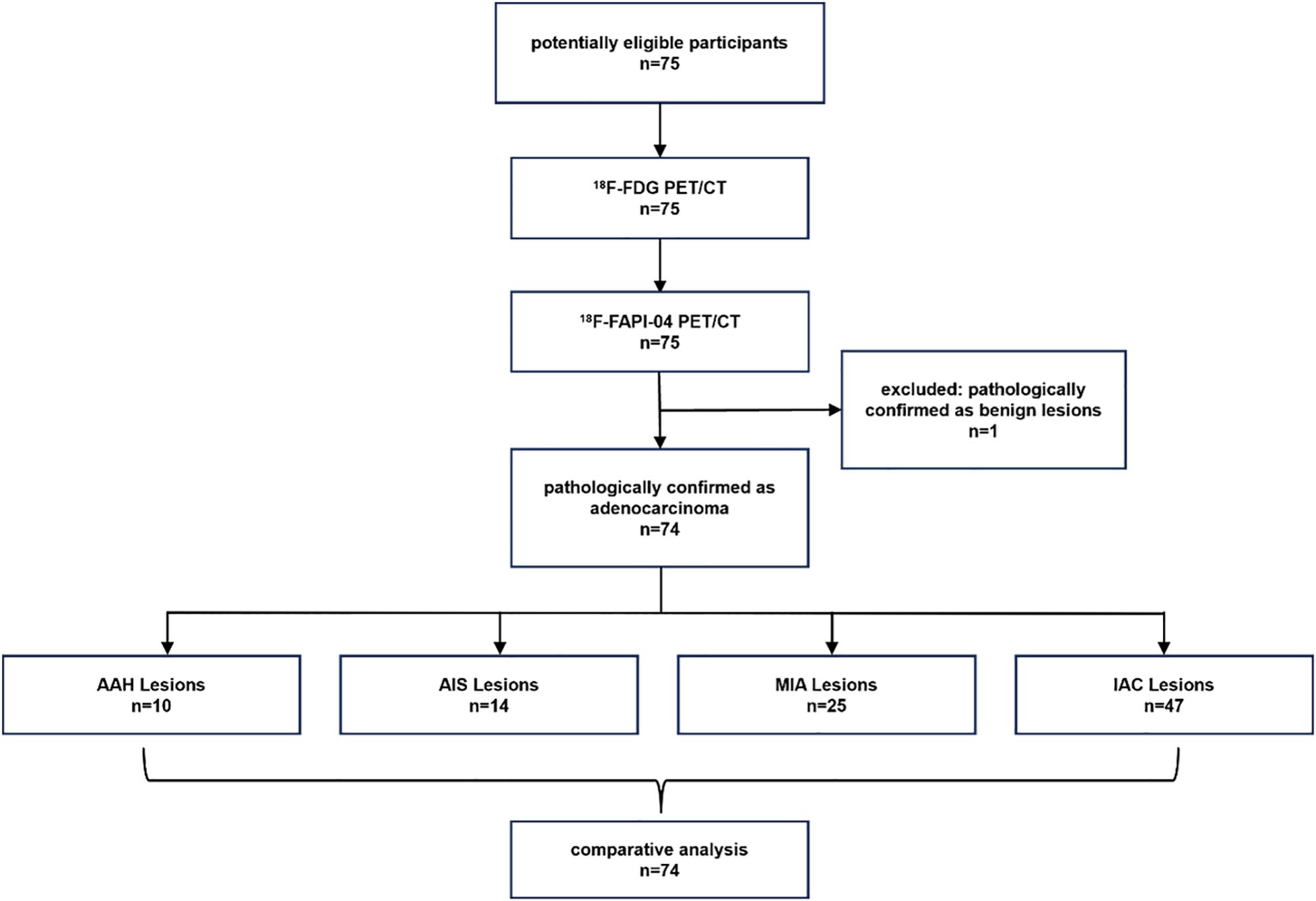 Figure 1. The flow diagram shows details of participants' selection and exclusions. FAPI, fibroblast-activation protein inhibitor; FDG, fluorodeoxyglucose; 18F, fluorine 18; AAH, atypical adenomatous hyperplasia; AIS, adenocarcinoma in situ; MIA, microinvasive adenocarcinoma; IAC, invasive adenocarcinoma.