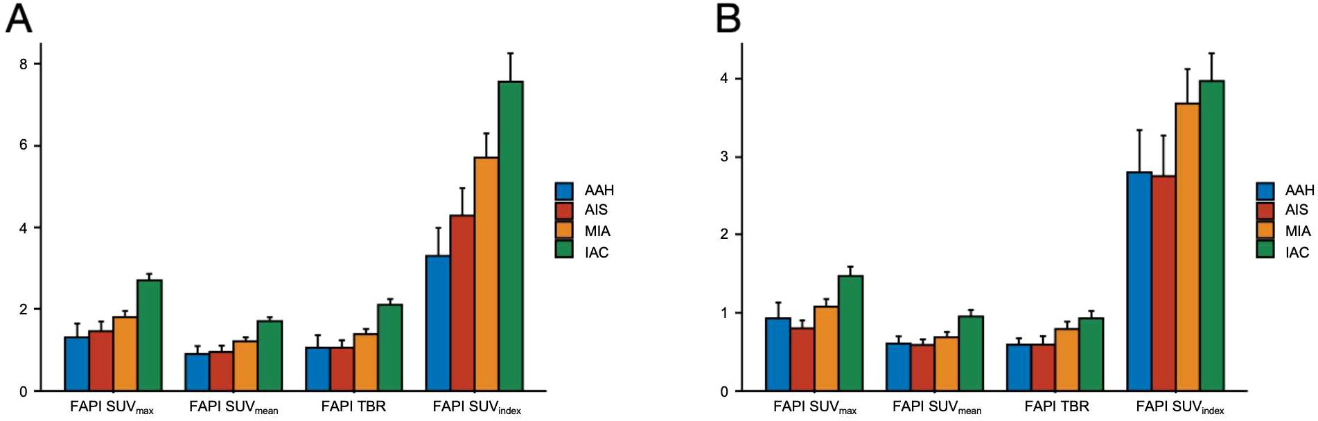Figure 2. Comparison of 18F-FAPI-04 and 18F-FDG PET/CT for different pathological subtypes of GGNs. (A) Bar chart shows a comparison of 18F-FAPI-04 PET/CT for different pathological subtypes of GGNs. (B) The bar graph compares different pathological subtypes of GGNs evaluated by 18F-FDG PET/CT. FAPI, fibroblast-activation protein inhibitor; FDG, fluorodeoxyglucose; SUVmax, maximum standardized uptake value; SUVmean, mean standardized uptake value; SUVindex, the ratio of SUVmax of lesion to SUVmax of contralateral normal lung paranchyma; TBR, target-to-background ratio; AAH, atypical adenomatous hyperplasia; AIS, adenocarcinoma in situ; MIA, microinvasive adenocarcinoma; IAC, invasive adenocarcinoma.