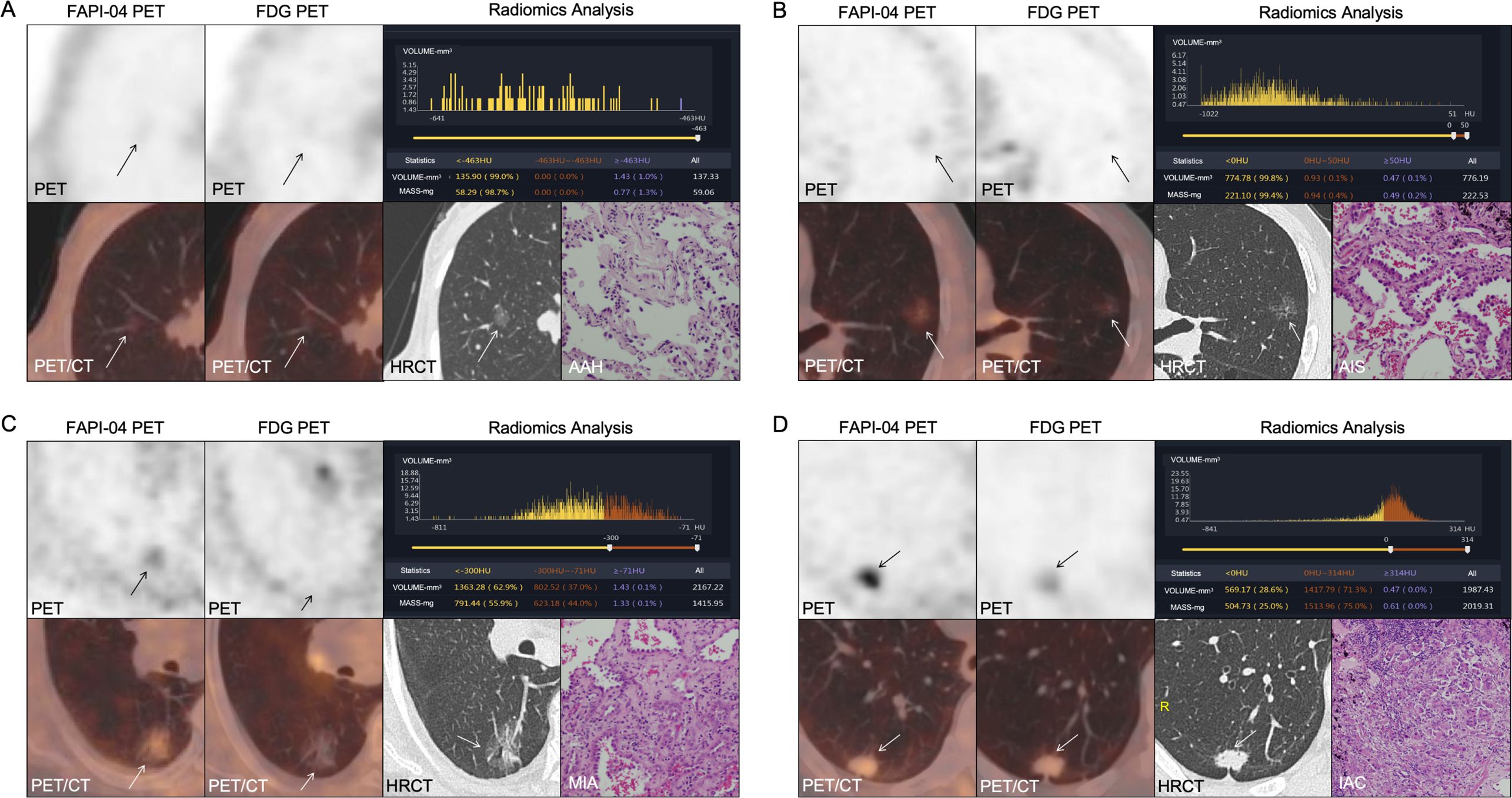 Figure 3. (A–D) 18F-FAPI-04 and 18F-FDG PET/CT images, histogram distribution of CT attenuation values and pathological images of 4 different types GGNs (arrows): (A) AAH. (B) AIS. (C) MIA. (D) IAC. FAPI, fibroblast-activation protein inhibitor; FDG, fluorodeoxyglucose; AAH, atypical adenomatous hyperplasia; AIS, adenocarcinoma in situ; MIA, microinvasive adenocarcinoma; IAC, invasive adenocarcinoma.
