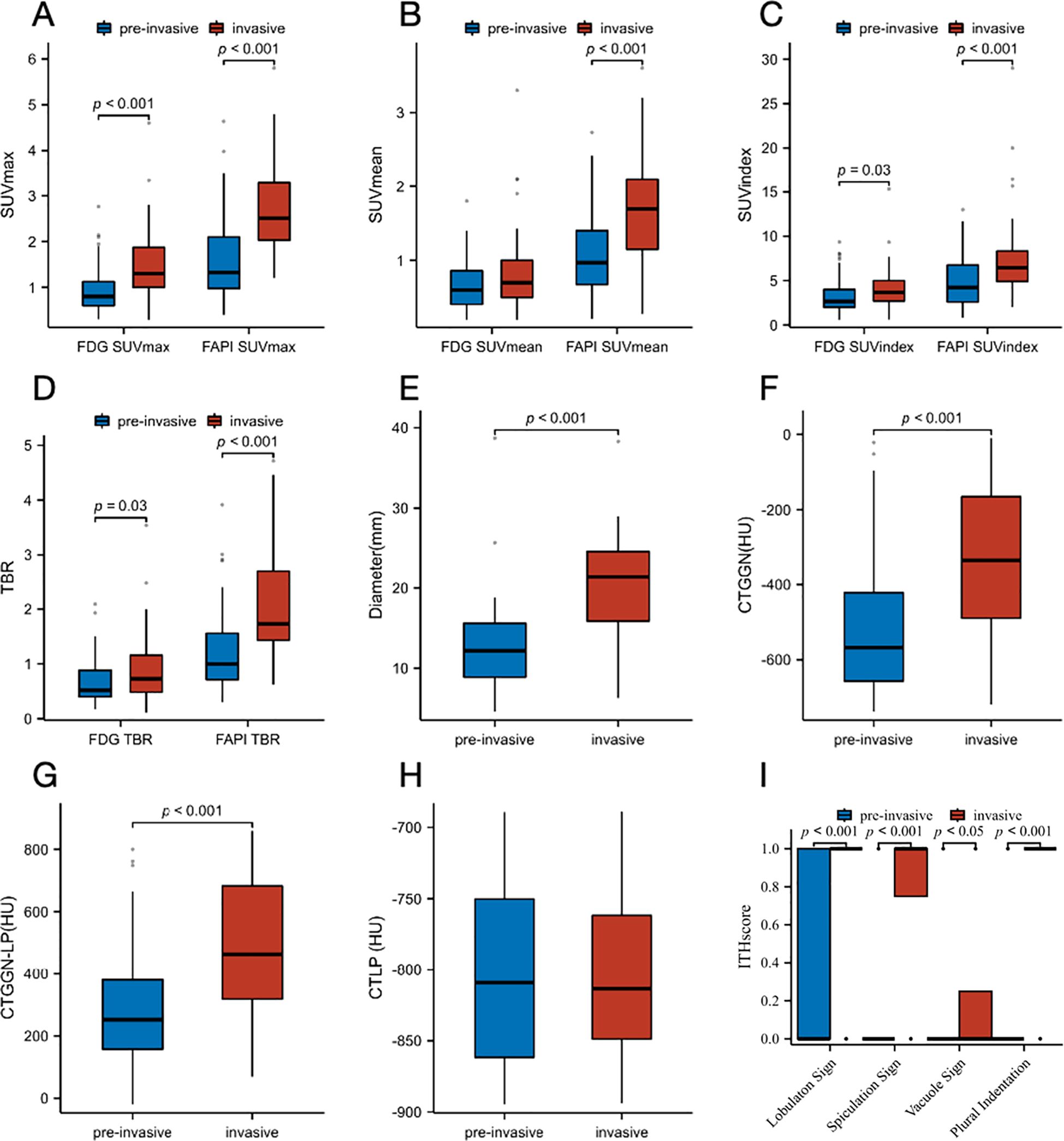 Figure 4. Box plots for the comparison of distribution of pre-invasive and invasive subtypes of GGNs. (A) SUVmax on 18F-FAPI-04 and 18F-FDG PET/CT. (B) SUVmean on Al18F-NOTA-FAPI-04 and 18F-FDG PET/CT. (C) SUVindex on Al18F-NOTA-FAPI-04 and 18F-FDG PET/CT. (D) TBR on Al18F-NOTA-FAPI-04 and 18F-FDG PET/CT. (E) Diameter (mm). (F) CTGGN (HU). (G) CTLP (HU). (H) CTGGN-LP (HU). (I) Imaging manifestations (lobulaton sign, spiculation sign, vacuole sign and plural indentation). FAPI, fibroblast-activation protein inhibitor; FDG, fluorodeoxyglucose; SUVmax, maximum standardized uptake value; SUVmean, mean standardized uptake value; SUVindex, the ratio of SUVmax of lesion to SUVmax of contralateral normal lung paranchyma; TBR, target-to-background ratio; CTGGN, the attenuation values of the GGN component; CTLP, the attenuation values of normal lung parenchyma adjacent to GGN; CTGGN-LP, the difference between CTGGN and CTLP; HU, Hounsfield Unit; ITH, intratumor heterogeneity.