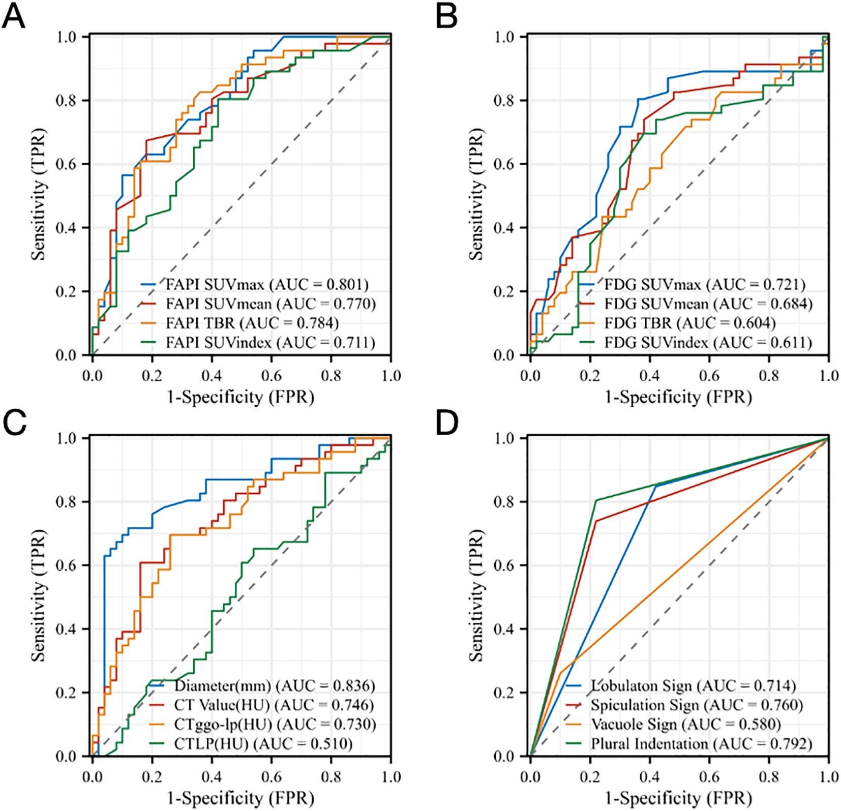 Figure 5. ROC analysis for different parameters (A) SUVmax, SUVmean, SUVindex, and TBR of Al18F-NOTA-FAPI-04 PET/CT, (B) SUVmax, SUVmean, SUVindex, and TBR of 18F-FDG PET/CT, (C) Diameter (mm), CTGGN (HU), CTLP (HU), CTGGN-LP (HU) and (D) Imaging manifestations (lobulaton sign, spiculation sign, vacuole sign and plural indentation) derived from the two tracers for identifying the Invasion of GGNs. FAPI, fibroblast-activation protein inhibitor; FDG, fluorodeoxyglucose; SUVmax, maximum standardized uptake value; SUVmean, mean standardized uptake value; SUVindex, the ratio of SUVmax of lesion to SUVmax of contralateral normal lung paranchyma; TBR, target-to-background ratio; CTGGN, the attenuation values of the GGN component; CTLP, the attenuation values of normal lung parenchyma adjacent to GGN; CTGGN-LP, the difference between CTGGN and CTLP; AUC, area under the curve; TPR, true positive rate; FPR, false positive rate.