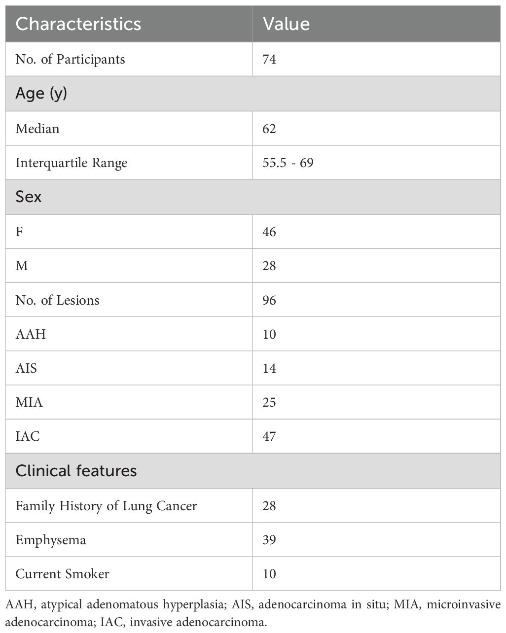 From September 2021 to October 2024, 74 participants (28 men, 46 women; median age, 62 years [interquartile range: 55.5 - 69.0 years]) and 96 lesions were enrolled in the study eventually. Figure 1 shows the study flowchart. Table 1 summarizes these participants’ basic and clinical characteristics. Among these participants, 44 were diagnosed with pre-invasive GGNs (10 AAH, 14 AIS, and 25 MIA lesions), and 30 patients had invasive GGNs (47 IAC lesions). One case was a fibrotic lesion. All individuals were newly diagnosed with GGNs and had no previous treatment.