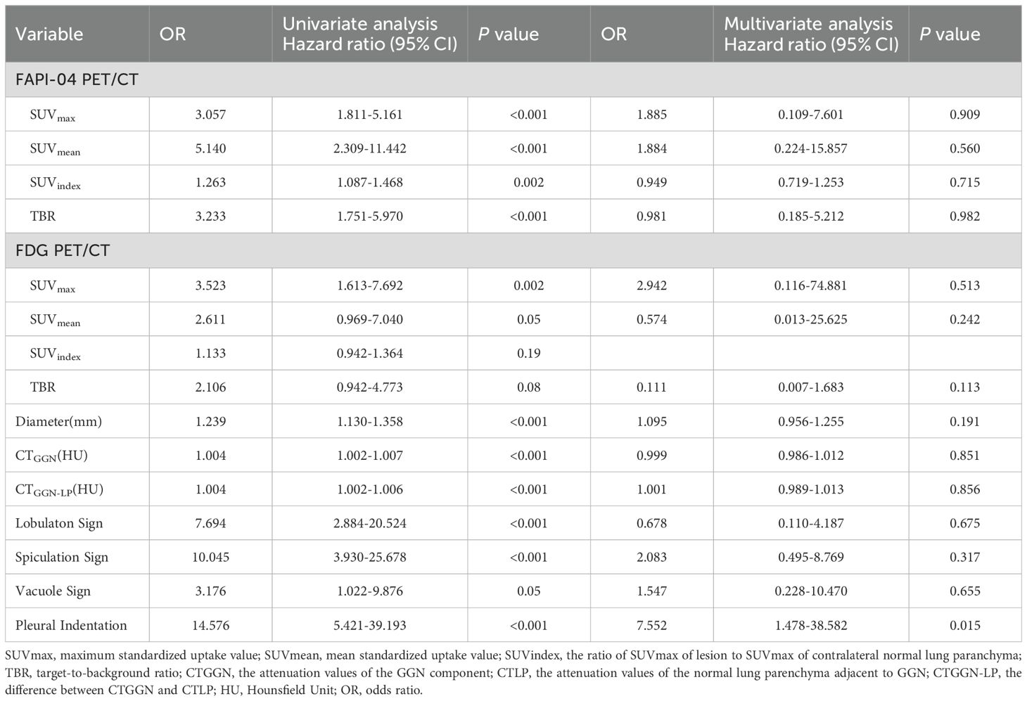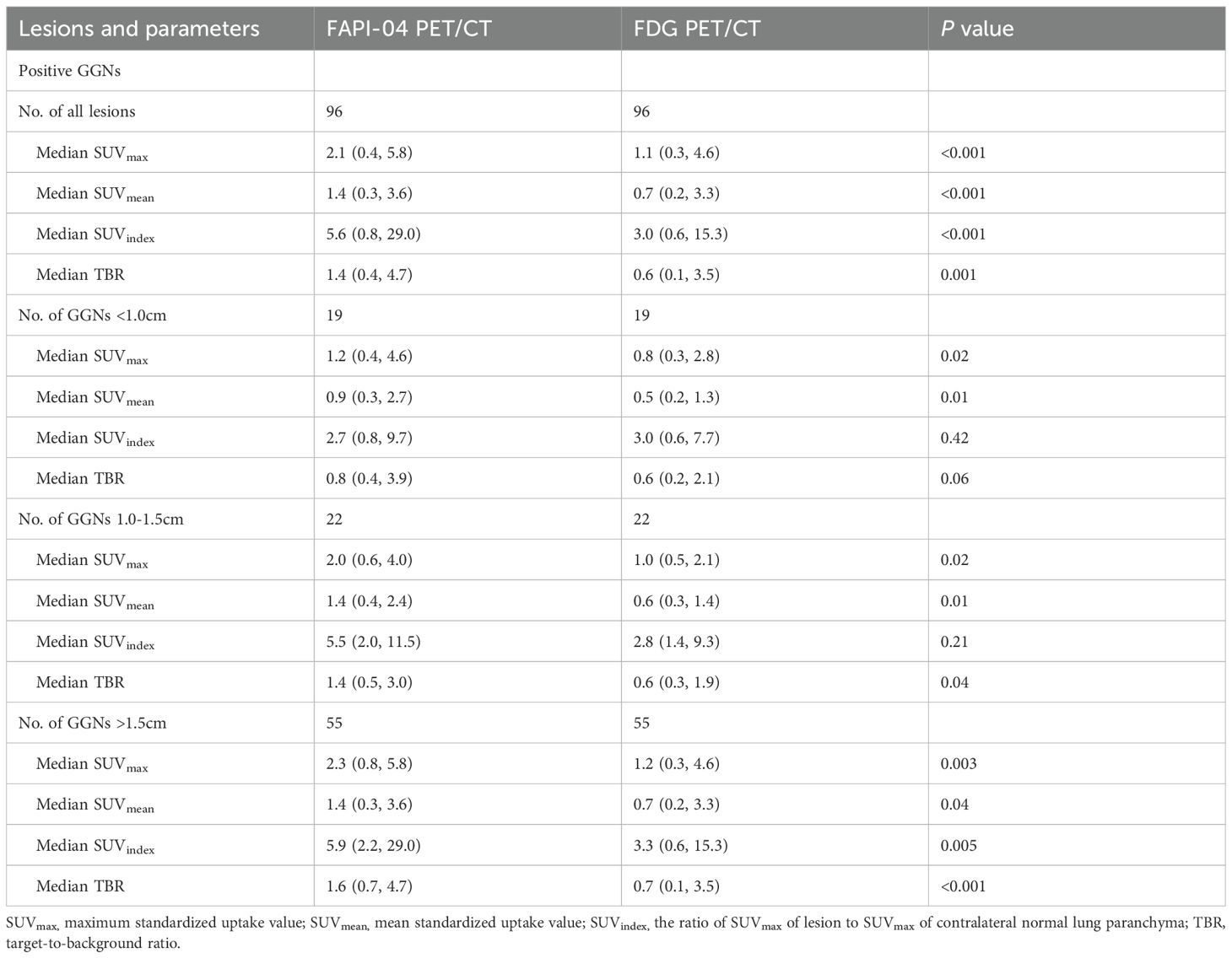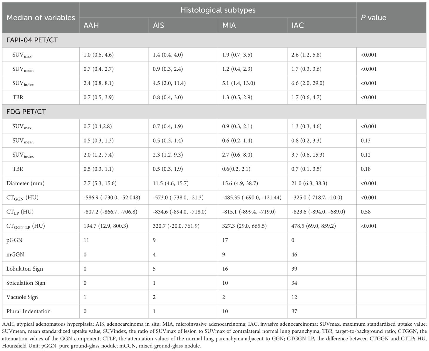 AAH, atypical adenomatous hyperplasia; AIS, adenocarcinoma in situ; AUC, area under the curve; FAP, fibroblast activation protein; FAPI, FAP inhibitor; FDG, fluorodeoxyglucose; FPR, false positive rate; GGN, ground-glass nodule; GGNs, ground-glass nodules; GMP, good manufacturing practice; HU, Hounsfield Unit; IAC, invasive adenocarcinoma; IQR, interquartile range; MIA, microinvasive adenocarcinoma; mGGN, mixed ground-glass nodule; OR, odds ratio; PET, positron emission tomography; pGGN, pure ground-glass nodule; PVE, partial volume effect; ROC, receiver operating characteristic; SD, standard deviation; SUVmax, maximum standardized uptake value; SUVmean, mean standardized uptake value; SUVindex the ratio of SUVmax of lesion to SUVmax of contralateral normal lung paranchyma; TPR, true positive rate; TBR, target-to-background ratio.