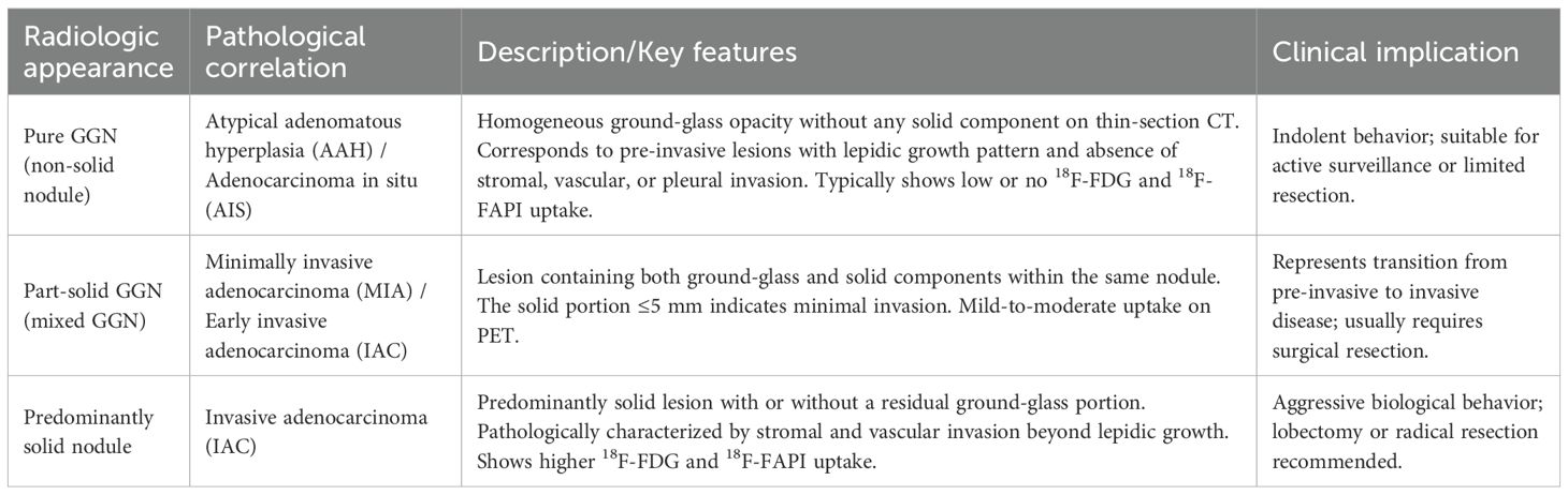 The current study shows that 18F-FAPI-04 PET/CT is better at identifying the invasion of GGNs than 18F-FDG PET/CT. Whereas 18F-FDG PET/CT had an AUC value for SUVmax of 0.721 and SUVmean of 0.684 according to the ROC curve, 18F-FAPI-04 PET/CT has a better value of 0.801 and 0.770. Our findings on all four parameters of the ROC curves agree with those reported by Shao et al. (29), who found that GGNs in the invasive adenocarcinoma (IAC) group showed higher SUVmax and SUVindex on FDG PET than those in the pre-invasive MIA group. Given that the growth and development of GGNs usually follow the natural progression from pre-invasive lesions (AAH, AIS, and MIA) to IAC (30), and that GGNs at different stages have different SUV uptake values (9, 31), our findings support that 18F-FAPI-04 PET/CT may have the potential to differentiate pathological subtypes and predict invasiveness of GGNs. The radiologic–pathologic correlation of ground-glass nodules is summarized in Table 6, illustrating how CT and PET characteristics reflect the histopathological spectrum from pre-invasive to invasive adenocarcinoma.