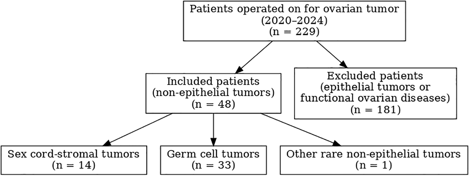 Flow chart of patient selection according to STROBE guidelines: 229 patients operated on for ovarian tumor between 2020 and 2024, including 48 with non-epithelial ovarian tumors.