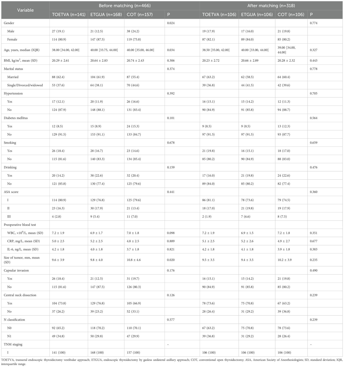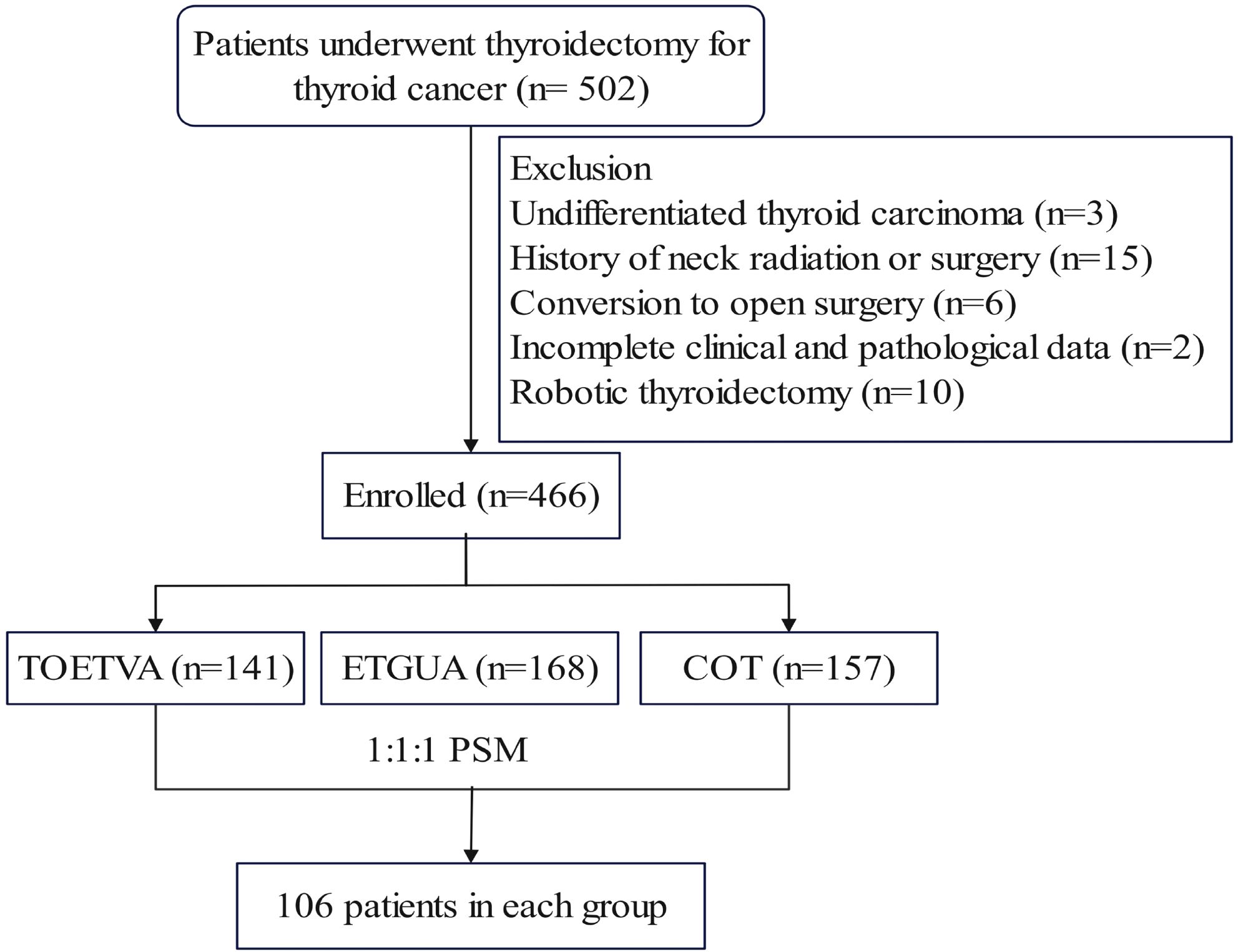 Methods: A total of 466 thyroid cancer patients who underwent surgery were initially included. After propensity score matching (PSM), 318 patients were analyzed, with 106 patients in each group (TOETVA, ETGUA, and COT). The primary outcomes compared included surgical parameters (incision length, blood loss, operation time, lymph node dissection), postoperative inflammation (WBC, CRP, IL-6), postoperative complications, postoperative pain (Visual Analog Scale, VAS), scar assessment (Vancouver Scar Scale, VSS), wound satisfaction, costs, and quality of life (36-Item Short Form Health Survey, SF-36).