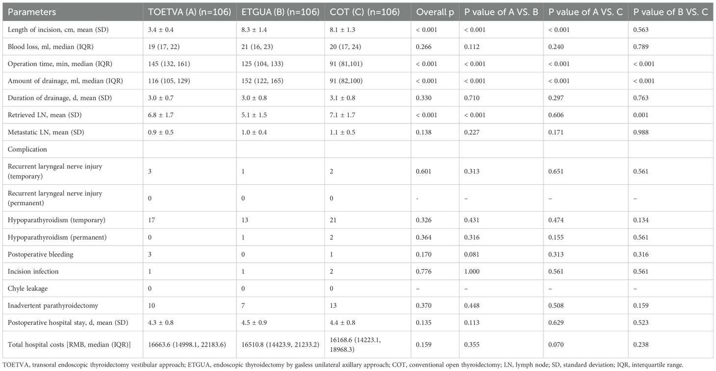 Laparoscopic surgery has garnered increasing attention due to its numerous advantages, such as magnification, which allows for a clearer surgical field and improved precision during surgery. Furthermore, laparoscopic approaches typically involve smaller, less noticeable incisions, providing excellent cosmetic benefits while ensuring effective treatment outcomes (8–10). As a result, laparoscopic thyroidectomy has become increasingly popular among both thyroid surgeons and patients. Various laparoscopic approaches have been developed, including the Transoral Endoscopic Thyroidectomy Vestibular Approach (TOETVA) and Gasless Unilateral Axillary Endoscopic Thyroidectomy (ETGUA) (11, 12). Each of these approaches has its own set of advantages and disadvantages, and there is still no consensus on which technique is the most suitable for clinical use. This study aims to compare the short-term and long-term outcomes of three surgical approaches for thyroid cancer: TOETVA, ETGUA, and COT.
