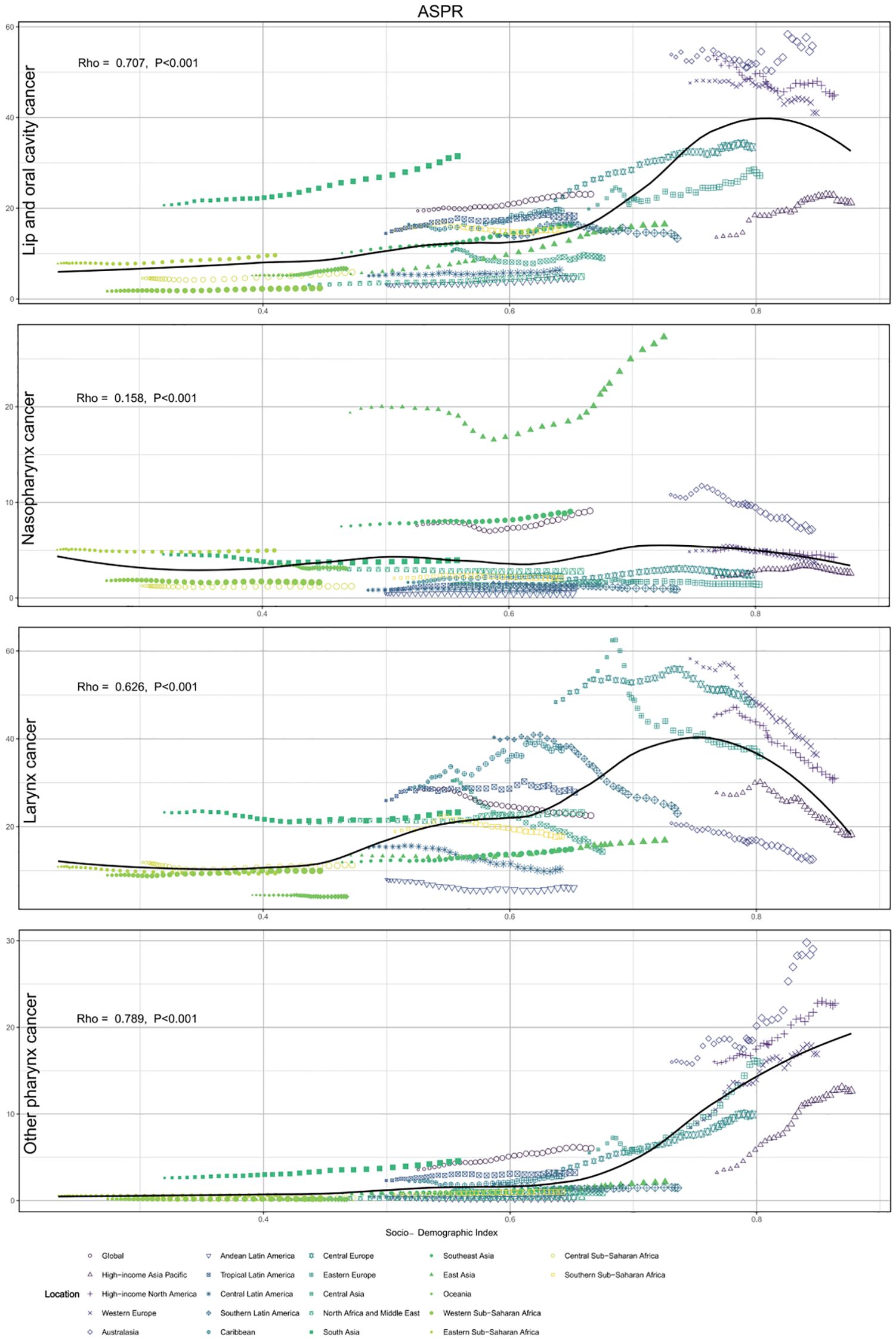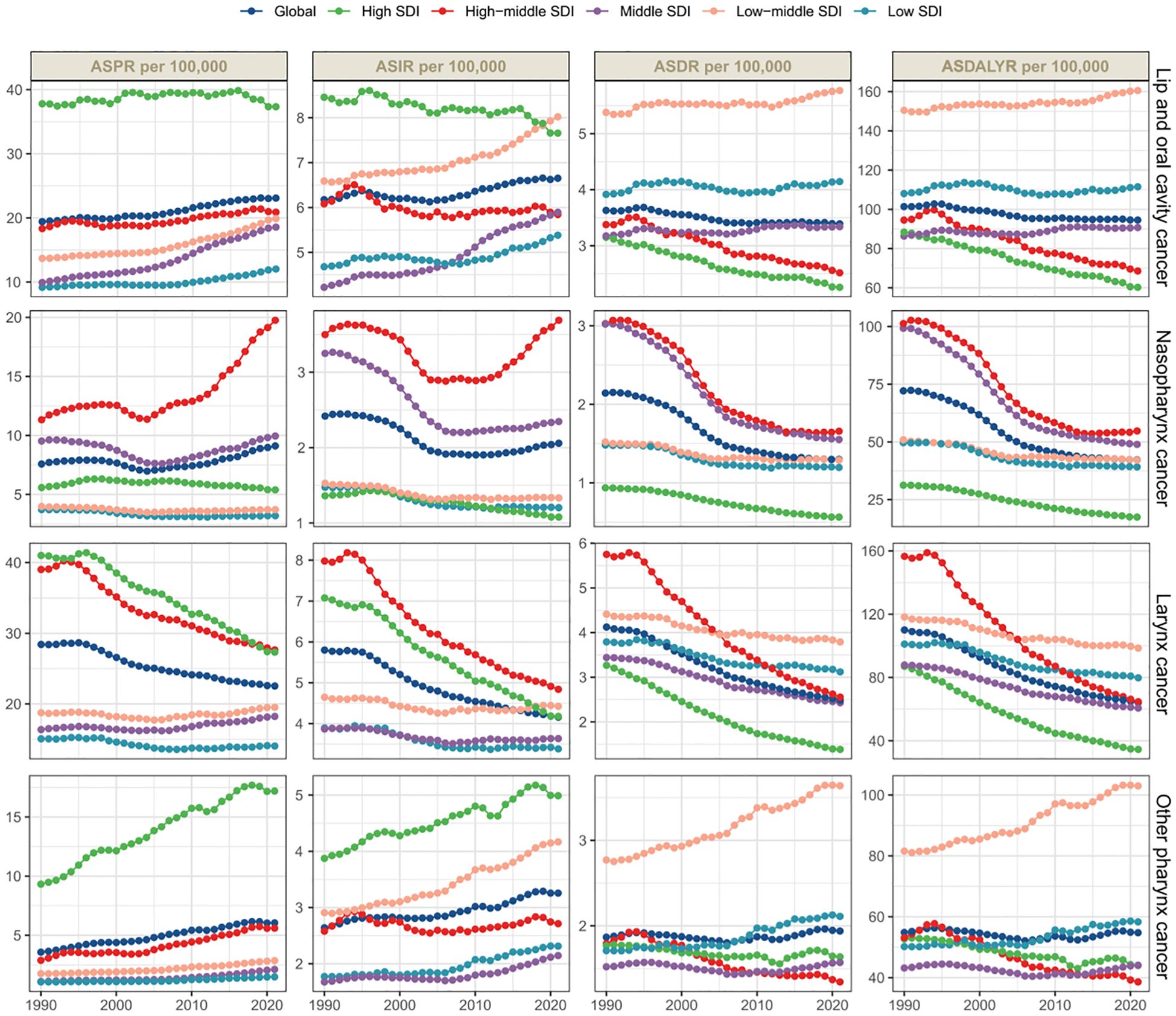 We use scatter plots to display the dynamic relationship between SDI and age-standardized rates (ASPR, ASIR, ASDR, and ASDALYR) across 21 global regions over the past 30 years, in order to analyze the impact of socioeconomic development (measured by SDI) on the trends of the four types of male head and neck cancers. In most regions, SDI is positively correlated with the ASPR of nasopharyngeal cancer and other pharyngeal cancers, both showing an upward trend as SDI rises.