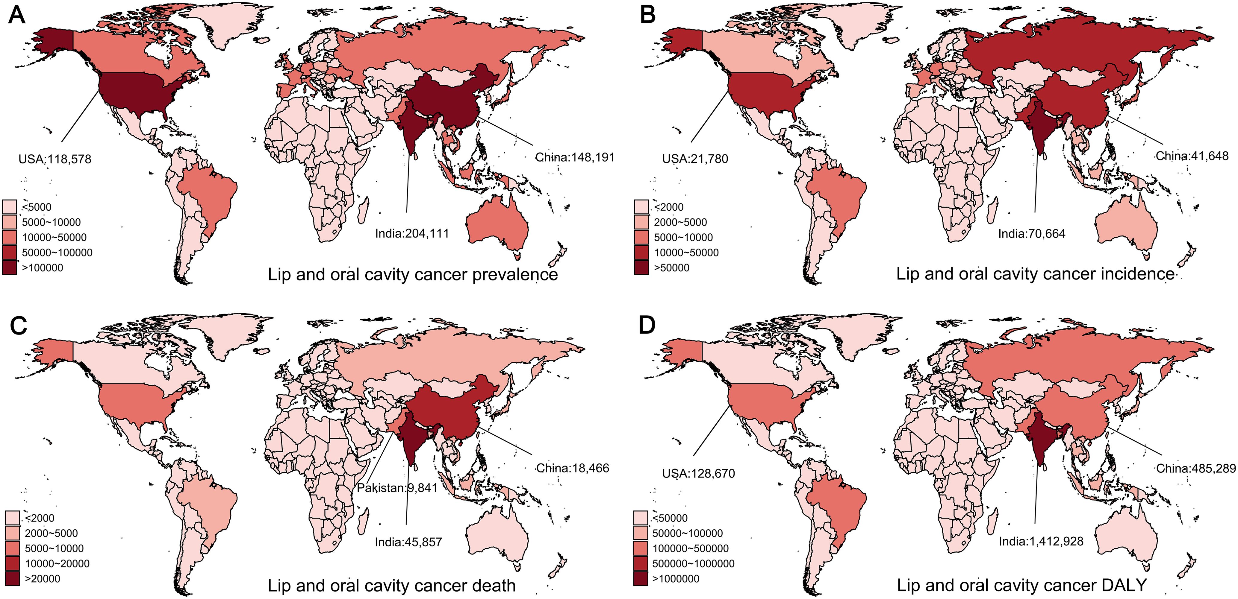 Figure 2. Global distribution of lip and oral cavity cancer prevalences, incidences, deaths, and disability-adjusted life years (DALYs) in 2021. (A) Prevalence of lip and oral cavity cancer. (B) Incidence of lip and oral cavity cancer. (C) Mortality from lip and oral cavity cancer. (D) DALYs from lip and oral cavity cancer.