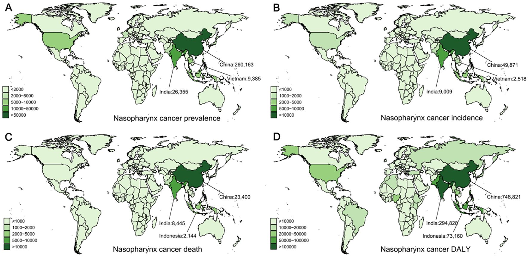 Figure 3. Global distribution of nasopharyngeal cancer prevalence, incidence, deaths, and disability-adjusted life years (DALYs) in 2021. (A) Prevalence of nasopharyngeal cancer. (B) Incidence of nasopharyngeal cancer. (C) Mortality from nasopharyngeal cancer. (D) DALYs from nasopharyngeal cancer.