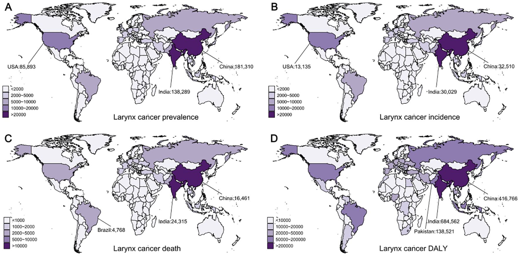 Figure 4. Global distribution of laryngeal cancer prevalence, incidence, deaths, and disability-adjusted life years (DALYs) in 2021. (A) Prevalence of laryngeal cancer. (B) Incidence of laryngeal cancer. (C) Mortality from laryngeal cancer. (D) DALYs from laryngeal cancer.
