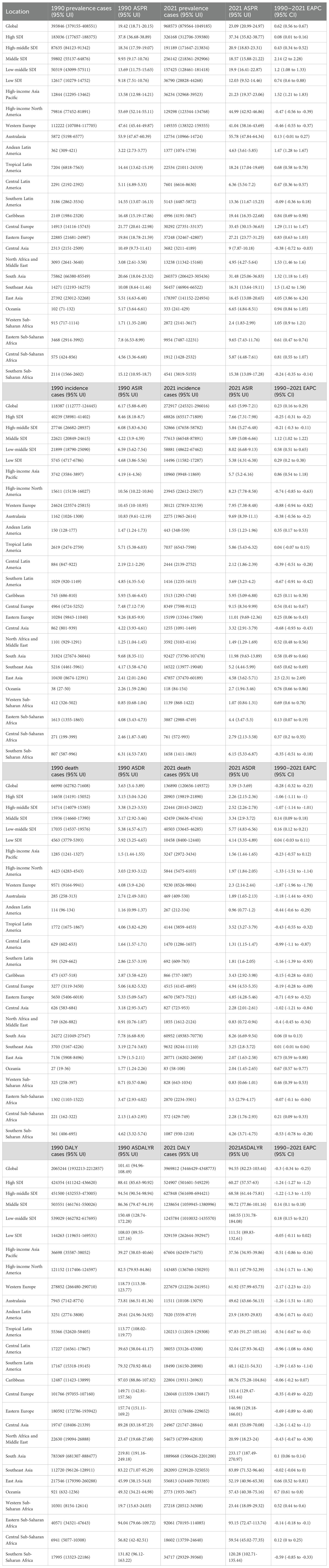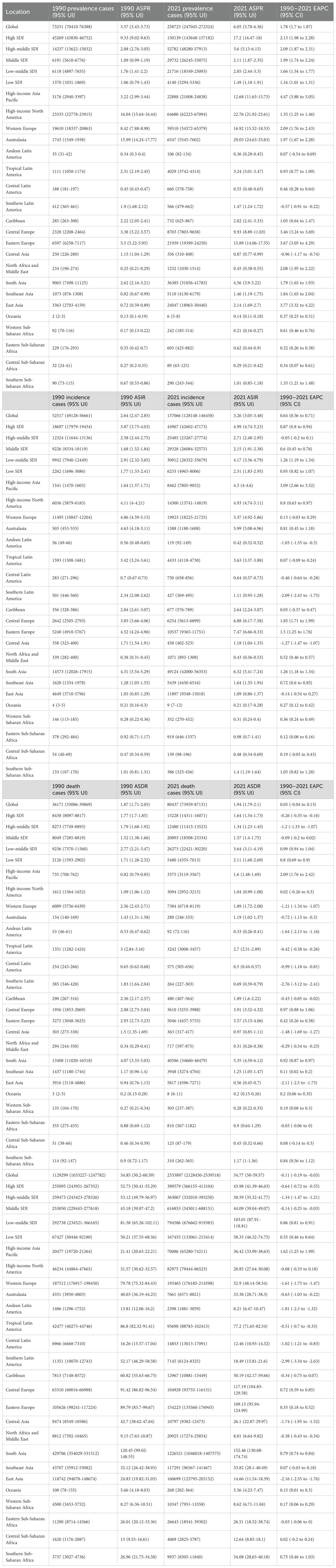 Table 2. Global and regional trends in nasopharynx cancer burden: Prevalence, incidence, mortality, and disability-adjusted life years (1990-2021).
