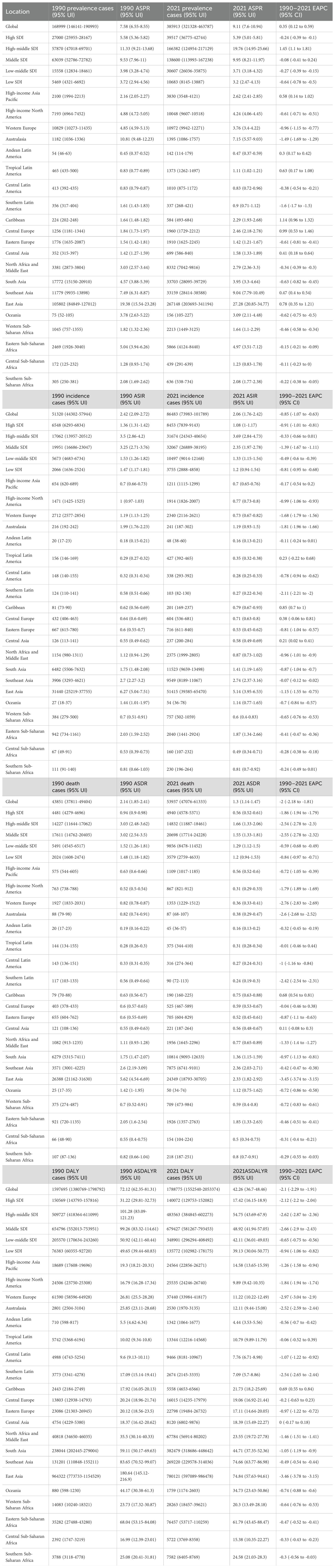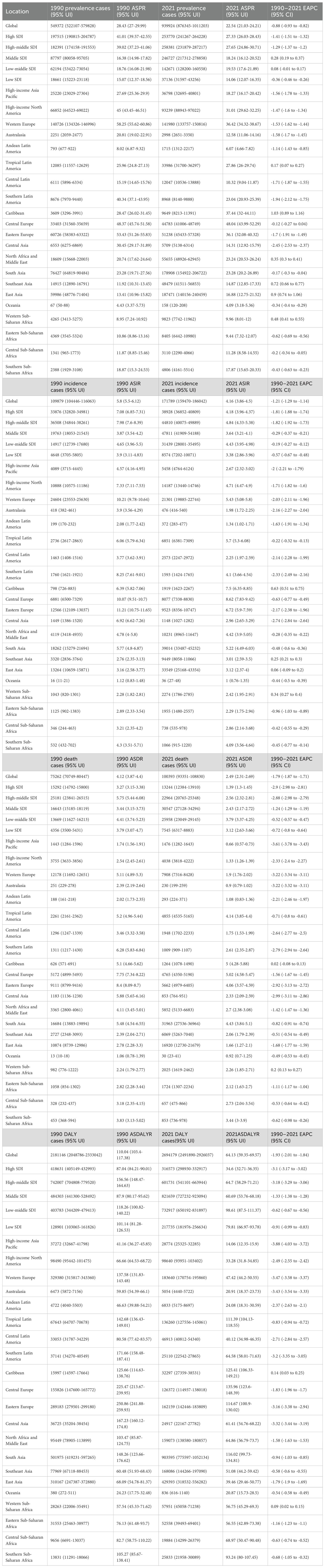 The EAPC is estimated using a regression model that evaluates trends in age-standardized rates (ASR) over time (10). The regression formula is expressed as: , where Y is the natural logarithm of the ASR, X represents the year, α is the intercept, β denotes the trend (slope), and e is the error term. The EAPC is calculated using the equation: EAPC = 100 × [exp() - 1]. This value represents the annual percentage change in ASR. This value represents the annual percentage change in ASR. Positive EAPC values with 95% confidence intervals (CIs) above zero indicate an increasing trend, while negative values signify a decreasing trend. For all the indicators in this study, the uncertainty intervals (UIs) are reported as 95% uncertainty intervals (UI) derived from 1,000 posterior draws. These intervals provide a measure of variability in the data, accounting for the uncertainty in the model estimates. For the EAPC, 95% confidence intervals (CIs) are used to report the trend estimates.