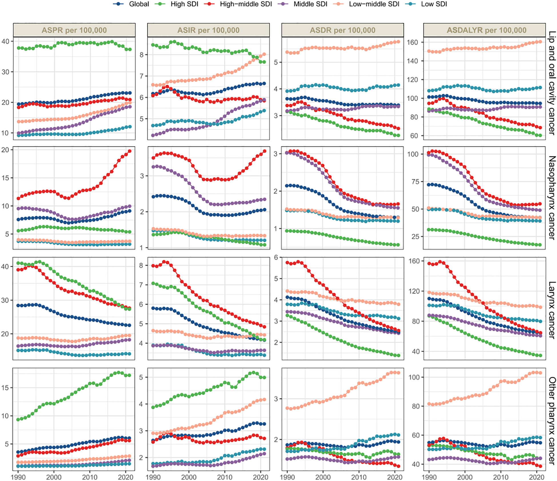 Lip and oral cavity cancer remains the most burdensome, while nasopharyngeal cancer is increasing in East and Southeast Asia. Laryngeal cancer has declined in high-SDI regions, while other pharyngeal cancers are rising. Gender and lifestyle are key risk factors, underscoring the need for early prevention, particularly in resource-limited areas. As the global population ages, targeted prevention and improved healthcare infrastructure are essential.