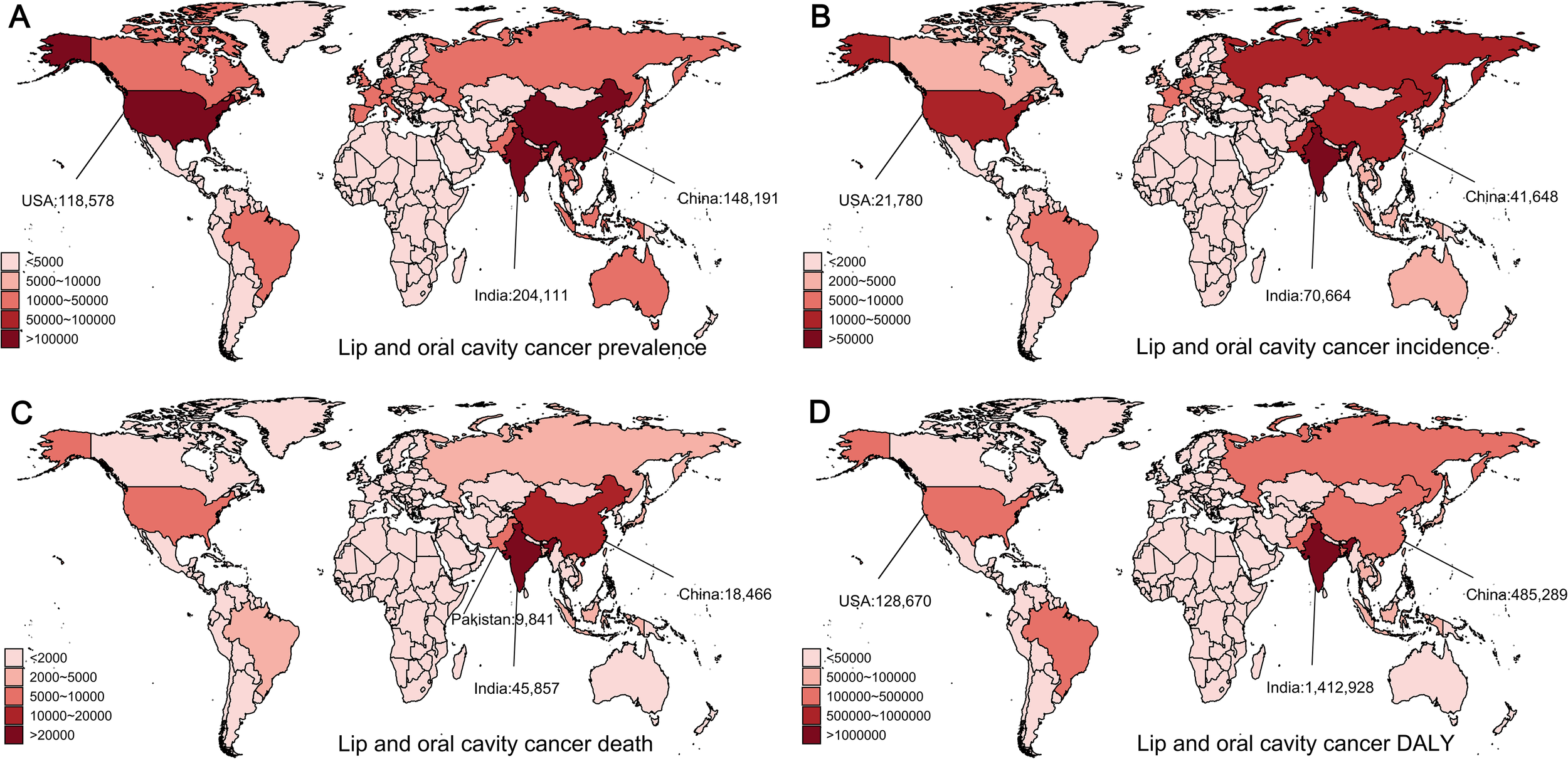 In the last three decades, the global age-standardized prevalence rate (ASPR) of lip and oral cavity cancer has shown an increasing trend (Figure 1). Specifically, during the years 1990 to 2021, the number of global cases of lip and oral cavity cancer increased from 393,846 to 968,573, with the ASPR rising from 19.42 to 23.09 (EAPC = 0.62, 95% CI: [0.56, 0.67]). Areas with high SDI recorded the greatest prevalence rates and ASPR (Figure 1). In 2021, South Asia reported the greatest number of cases, with 260,373 cases (95% UI: 206,423–305,436) (Table 1). Australasia had the greatest ASPR, reaching 55.78 (95% UI: 47.84–64.34), nearly 2.4 times the global average. At the country level, India had the greatest number of prevalence cases (204,111, 95% UI: 160,011–242,292), followed by China (148,191, 95% UI: 110,241–194,522) and the United States (118,578, 95% UI: 112,447–123,612) (Figure 2A), with around 50% of the worldwide new cases attributed to these three countries. Globally, Taiwan, China had the greatest ASPR (Supplementary Figure S1A).