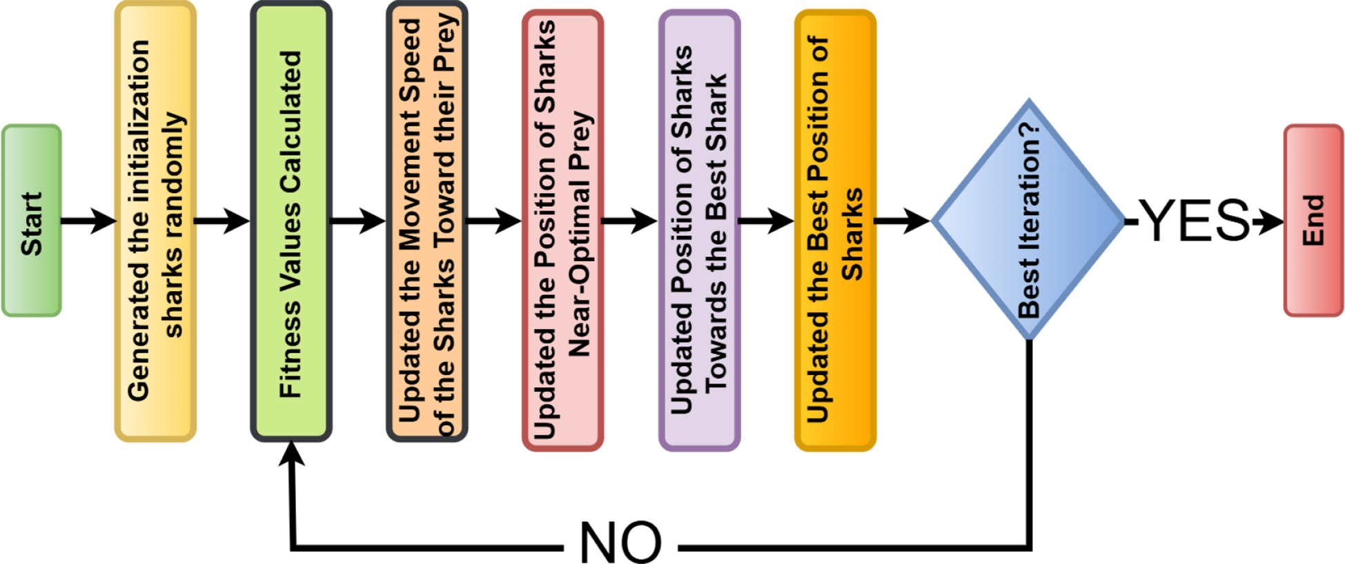 The algorithm iteratively works. A population of candidate solutions (sharks) evolves toward the optimal solution.