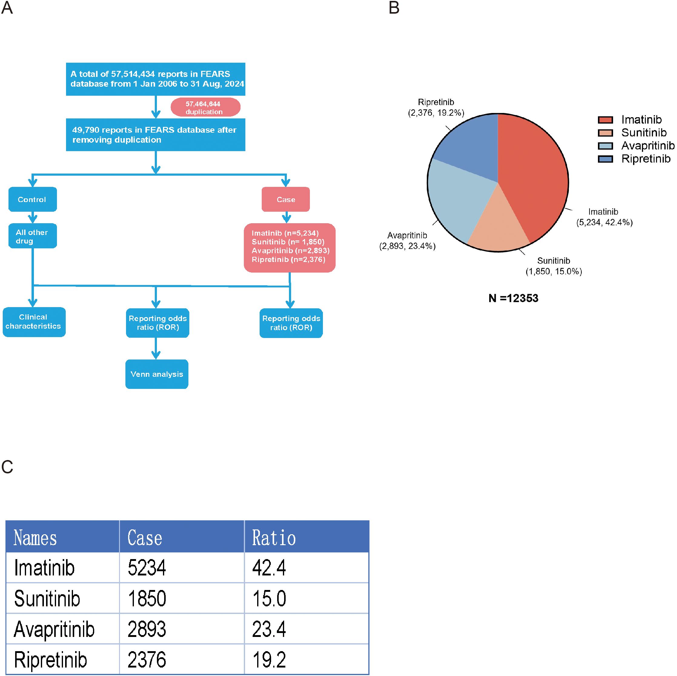 Figure 1. (A) Flowchart of study design. After duplication, 5,234 cases led by imatinib, 1,850 cases led by sunitinib, 2,893 cases led by avapritinib and 2,376 cases led by ripretinib were involved in this study. (B) Pi-chart representing the total number of cases and its distribution of individual TKIs. (C) Table representing the total number of cases and its distribution of individual TKIs.
