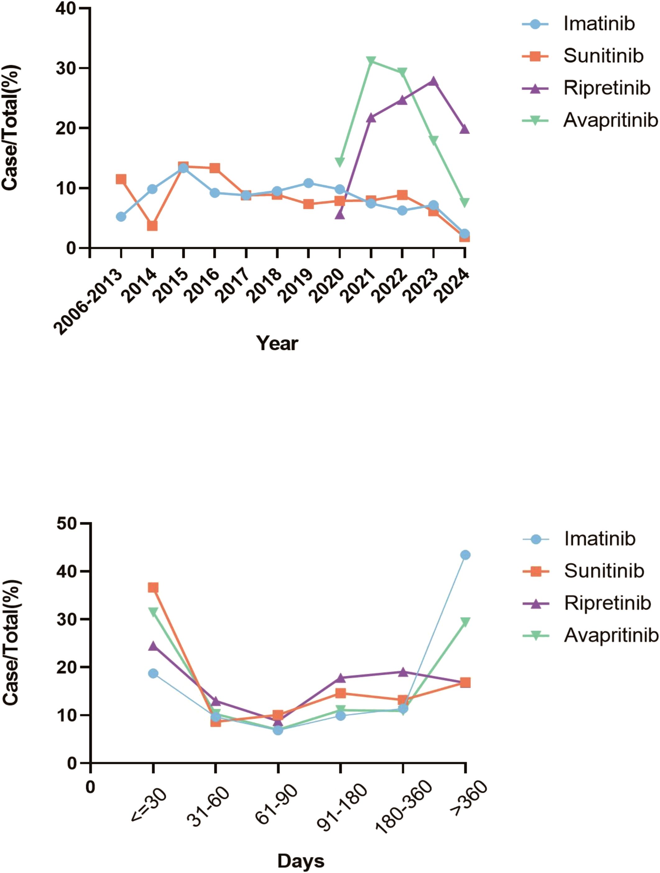 In terms of gender-related variations, male patients experienced more frequent AEs than female patients during TKIs treatment. Among patients under 18 years old, AE reports were the lowest. No significant age-related differences in AE reports were observed for imatinib and sunitinib users. However, patients over 65 years old experienced more AEs than those aged 18–65 when using avapritinib and ripretinib. The reports of imatinib and sunitinib were mostly originated form health-professions, accounting for 59.9% and 53.5% respectively, compared with 8.3% in avapritinib and 38.5% in ripretinib, and these reports from non-health profession were mainly from US, China and Japan. Additionally, death was the main recorded outcome for imatinib (n = 2,421) and sunitinib (n = 609), while hospitalization for avapritinib (n = 274) and ripretinib (n = 446). The time distribution analysis of post-marketing AE reports shows that ripretinib and avapritinib had an increase in reports during the first 1–3 years after launch, followed by a decline in later years. In contrast, imatinib and sunitinib had very few reports during their early post-marketing period, making it difficult to assess initial trends. To better understand their long-term reporting patterns, charts for these two drugs display annual report counts for eight years or more after market entry.– Notably, AEs mostly occurred within the first month of therapy and again after one year (Figure 2).
