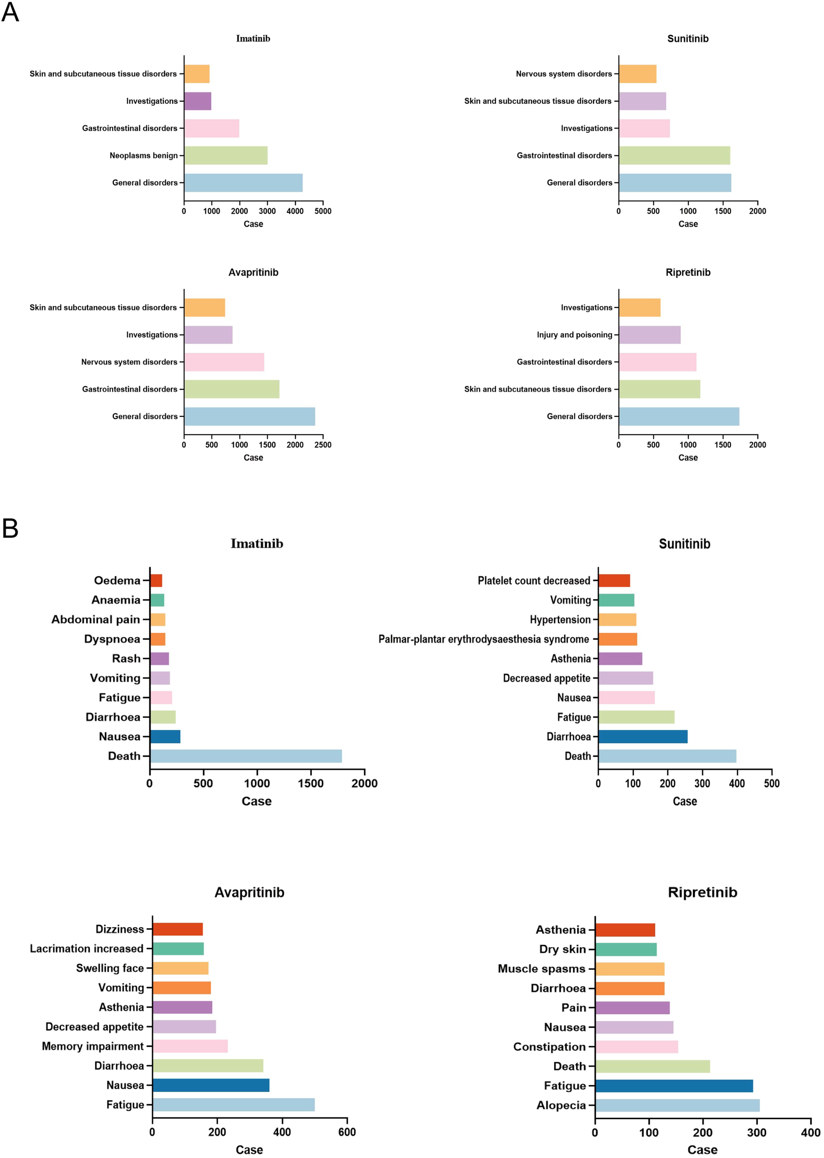 Figure 3. AEs most frequent for all four TKIs. (A) The top five AEs related to certain type of TKIs at SOC level were shown. General disorders was the most frequent SOC in all TKIs. (B) The top ten AEs related to certain type of TKIs at PT level were shown. Death was the most frequent PT in imatinib and sunitinib, while fatigue was the most common PT in avapritinib, alopecia was most common in ripretinib.