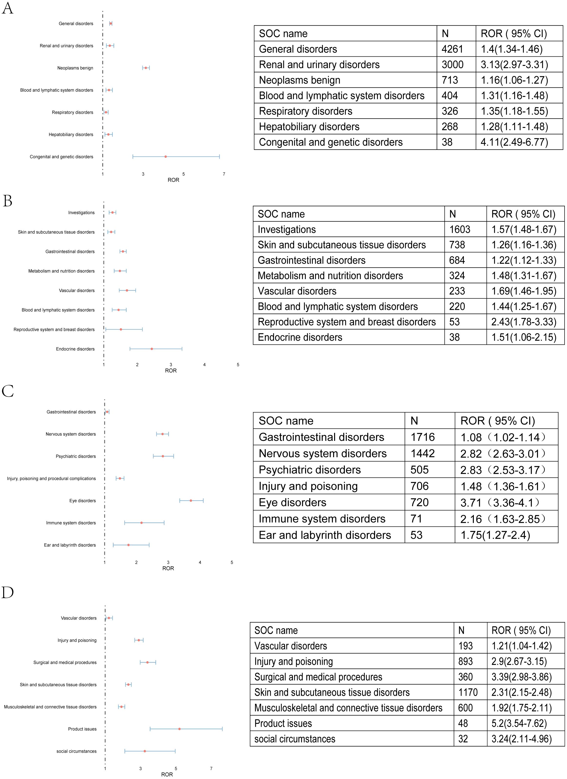 Figure 4. AEs related to all four TKIs at SOC level. (A) AEs related to imatinib were shown. Congenital and genetic disorders has the highest ROR value. (B) AEs related to sunitinib were shown. Reproductive system and breast disorders has the highest ROR value. (C) AEs related to avapritinib were shown. Eye disorders has the highest ROR value. (D) AEs related to ripretinib were shown. Product issues has the highest ROR value.