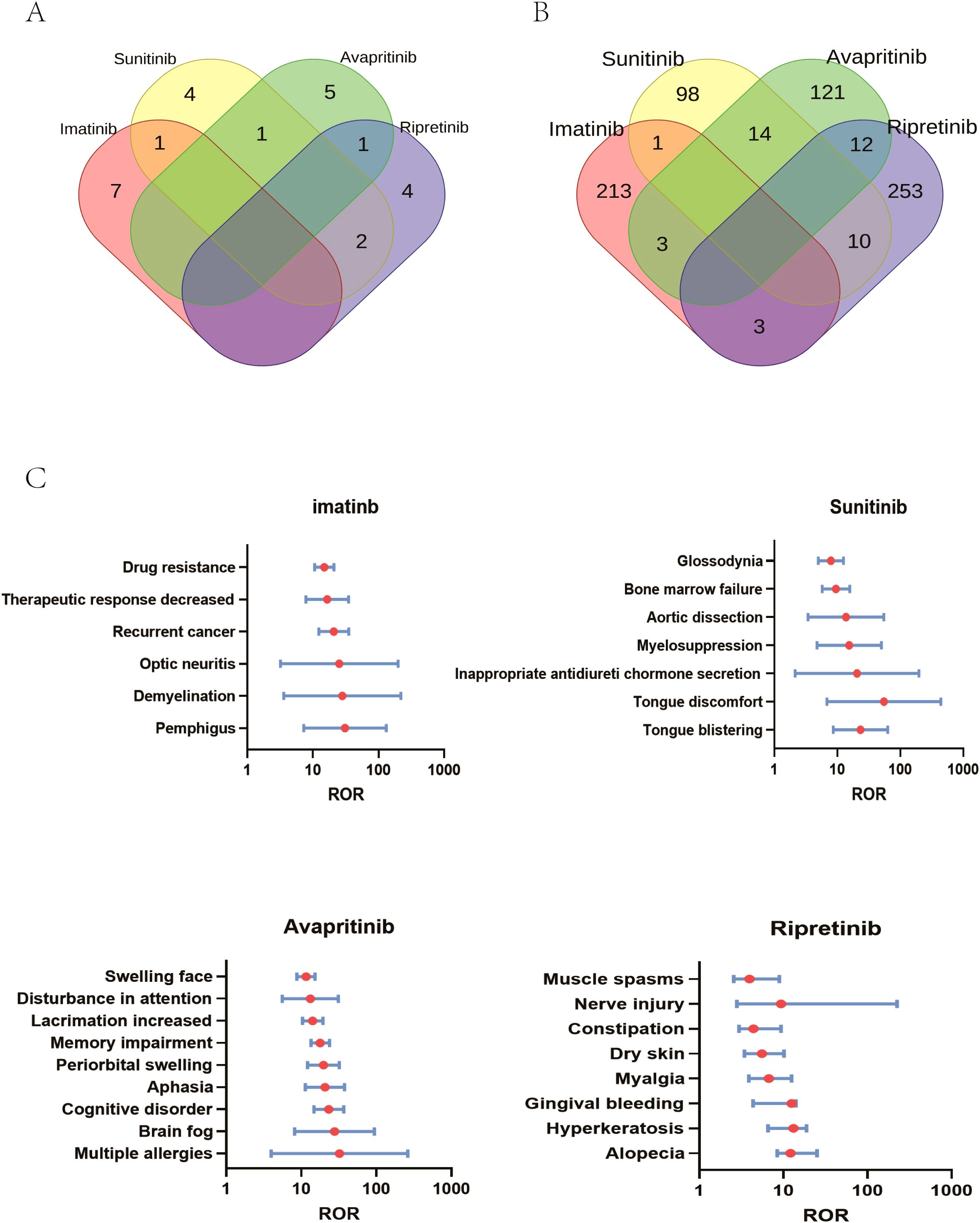 Figure 5. SOC specialized in certain type of TKIs. (A) AEs specialized in TKIs on SOC level: At the SOC level, 8 AEs were associated with imatinib and sunitinib, while 7 AEs were linked to the other two drugs. Specifically, 7 SOCs were unique to imatinib, 4 to sunitinib, 5 to avapritinib, and 4 to ripretinib. (B) AEs specialized in TKIs on PT level: At the PT level, 220 AEs were associated with imatinib, 123 AEs were associated with sunitinib, 150 AEs were associated with avapritinib, 278 AEs were associated with ripretinib. Specifically, 213 AEs were unique to imatinib, 98 to sunitinib, 121 to avapritinib, and 253 to ripretinib. (C) Comparison of significant AEs at the PT level among four TKIs showed PTs with ROR values over 10. 6 PTs, including drug resistance, were significantly linked to imatinib, 7, including tongue discomfort, to sunitinib, 9 to avapritinib and 8 to ripretinib.