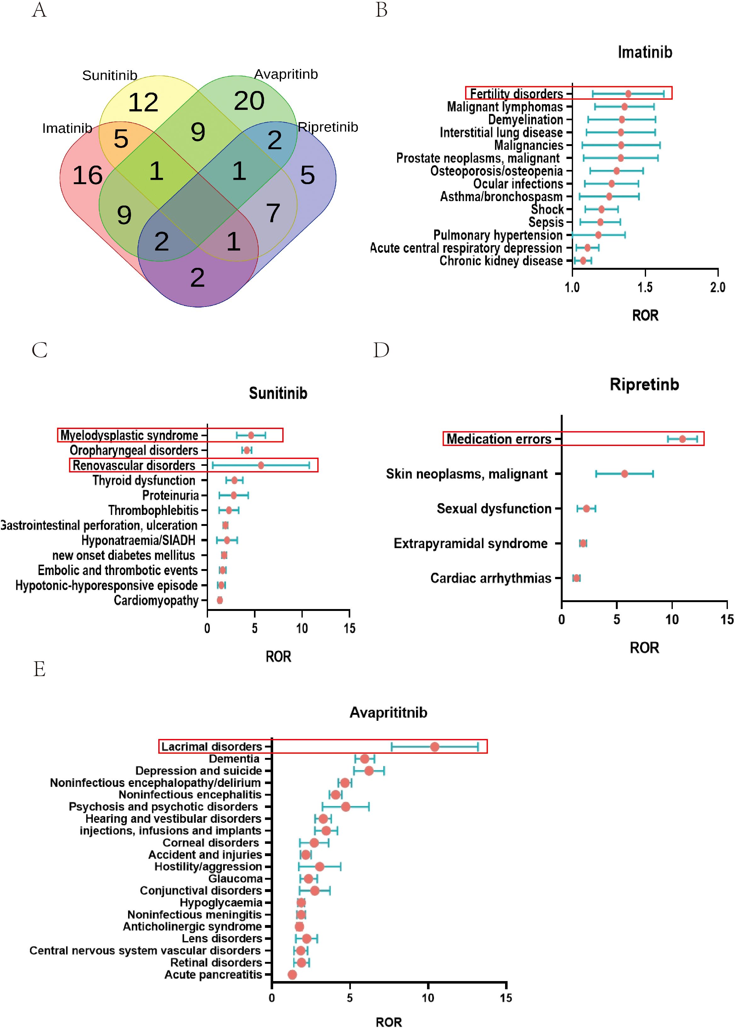 Figure 6. SMQ specialized in certain type of TKIs. (A) AEs specialized in TKIs on SMQ level: At the SMQ level, Imatinib, sunitinib, avapritinib, and ripretinib were associated with 36, 36, 44, and 20 SMQs, respectively. Imatinib had 16 specific SMQs, sunitinib had 12 specific SMQs, avapritinib had 20 specific SMQs, ripretinib had 5 specific SMQs. (B) SMQs related to imatinib were shown, with reproductive disorders showing the highest ROR value. (C) SMQs related to sunitinib were shown, with tumor lysis syndrome showing the highest ROR value. (D) SMQs related to ripretinib were shown, with medication errors showing the highest ROR value. (E) SMQs related to avapritinib were shown, with lacrimal disorders showing the highest ROR value.