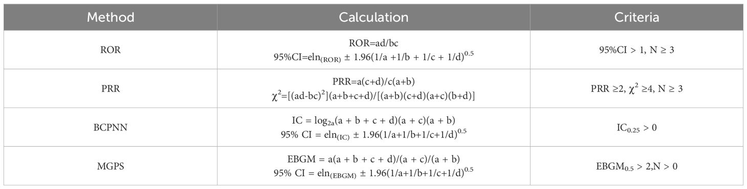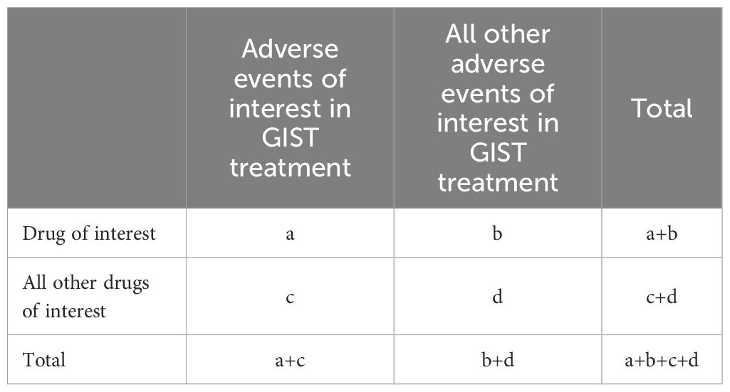 Patient demographics with GISTs undergoing TKIs treatment were illustrated through averages and variability measures for continuous data, and counts and proportions for categorical data. To discern the correlations between pharmaceuticals and negative reactions, methodologies such as the relative odds ratio (ROR), the proportional reporting ratio (PRR), the Bayesian confidence propagation neural network (BCPNN), and the multi-item gamma-Poisson shrinker (MGPS) were employed (7, 8). The meaning of each If any one of the previously mentioned four benchmarks were met, the AE was considered to have statistical significance in PT and SOC, as noted in Table 1, the meanings of each letter in these formulas are shown in the form of a Two-by-two contingency table (Table 2). For SMQ, we used a single ROR to determine the significance of the association between AEs and TKIs, the correspondence table between SMQ and PT is presented in the Supplementary Table.
