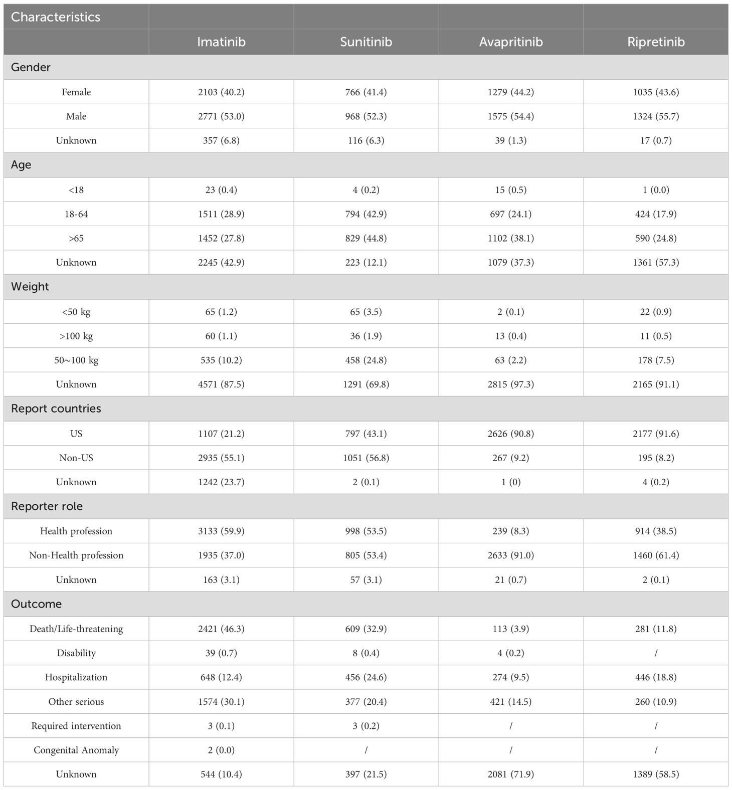 The FDA Adverse Event Reporting System database (FAERS) is a significant worldwide database for monitoring pharmaceuticals after they are released on the market, acts as a tool for gathering data on unexpected AEs via voluntary submissions, thus facilitating the prompt detection of medication-related safety issues within broad demographic settings (6).This study primarily aimed to systematically identify and compare the AE spectra associated with four distinct tyrosine kinase inhibitors, namely imatinib, sunitinib, avapritinib and ripretinib that approved for GISTs treatment. We sought to detect potential drug-specific safety signals and previously unreported or unexpected AE signals strongly linked to individual TKIs. Finally, the study aimed to provide a comprehensive, real-world evidence-based comparison of the AE profiles across these agents.