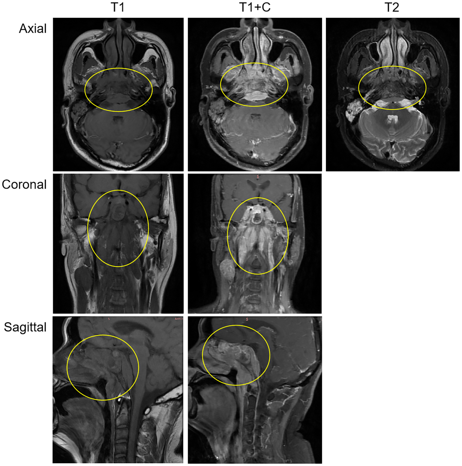 The MRI demonstrated a soft tissue mass measuring 38 mm×20 mm in the largest axial dimension, which showed isointensity signal on T1 WI and slightly hyperintense signal on T2W with significant enhancement after contrast-enhanced scan. The mass involves the surrounding normal tissue. The findings suggest nasopharyngeal carcinoma; Multiple enlarged lymph nodes, of varying sizes, were observed in the retropharyngeal space and bilateral cervical regions, suggestive of metastatic involvement.