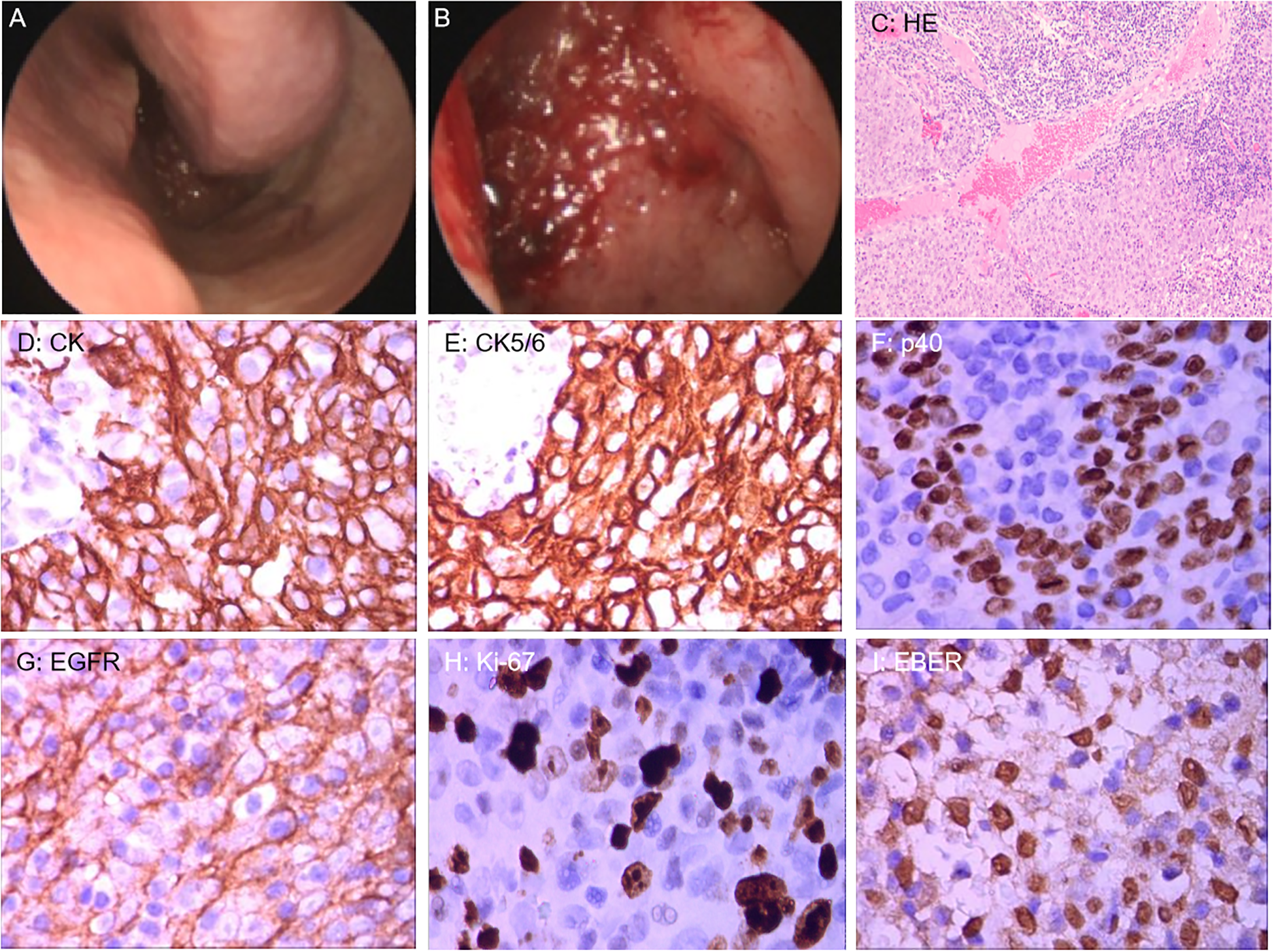 (A, B) Nasal endoscopic examination revealed mucosal thickening of the nasopharyngeal roof and posterior wall. (C) Hematoxylin and Eosin staining (100x) revealed tumor cells with nested growth in abundant lymphoid tissue. (D–H) Immunohistochemical staining (400x): CK and CK5/6 showed diffuse and strongly positive expression in the cytoplasm of tumor cells; p40 showed strongly positive expression in the nuclei of tumor cells; EGFR showed positive expression on the membrane of tumor cells; Ki-67 showed positive expression in the nuclei of tumor cells. (I) Epstein-Barr virus-encoded RNA (EBER) in situ hybridization (400x) revealed positive expression in the nuclei of tumor cells.