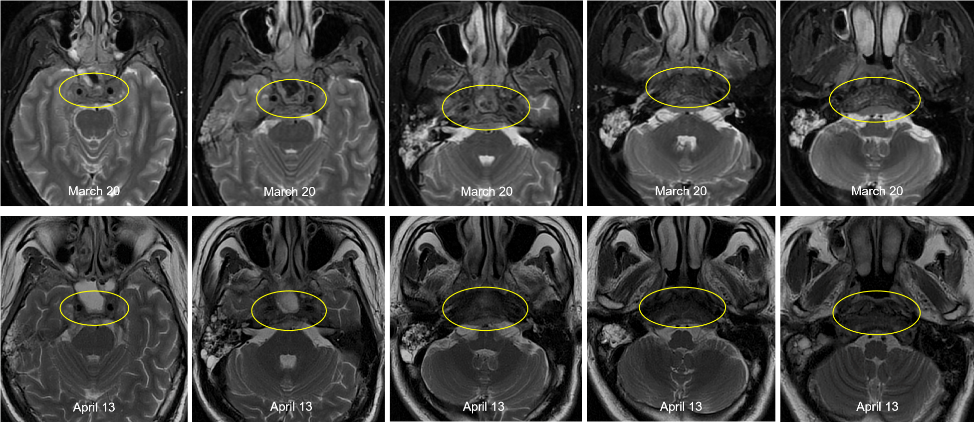 This patient was diagnosed with nasopharyngeal non-keratinizing squamous cell carcinoma (T4N2M1, stage IVB, AJCC 8th), which had indications of palliative chemoimmunotherapy, and we obtained informed consent from patients and families for all of our treatments. Therefore, the planned therapeutic regimen consists of gemcitabine (at a dose of 1 g/m2 on days 1 and 8) and cisplatin (40 mg/m2, days 1-2), plus tislelizumab (200 mg on day 1). Alleviation of reported symptoms was observed following the first dose, potentially reflecting treatment-induced tumor volume reduction and subsequent decreased mass effect on adjacent neural structures. But, on day 3 post-treatment, i.e. on March 29, the patient developed recurrent fever, peaking at 39.2 °C. He also developed severe paroxysmal stabbing pain in the right frontal area suggestive of trigeminal neuralgia, accompanied by increased numbness on the right face. The NRS pain score was 9. His labs were notable for high C-reactive protein (CRP) at 117.46mg/L. His blood culture results (e.g., bacteria and fungi) were negative. The fever is considered to be caused by a bacterial infection (gemcitabine administration on day 8 of the first cycle was withheld due to fever); however, it persisted despite antibiotic therapy, which included cefoperazone and ceftriaxone. After administration of dexamethasone, symptoms were not relieved, and morphine failed to provide adequate analgesic effect. To assess for pulmonary infection and evaluate whether tumor progression is contributing to the clinical deterioration, chest CT and cranial MRI were performed. The CT (April 6) revealed no significant infectious foci (Supplementary Figure 2). The MRI (April 13) demonstrated a slight reduction in tumor size compared to previous imaging (Figure 3).