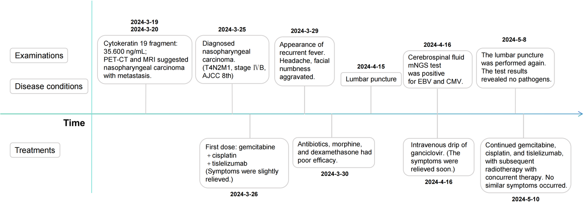 Respiratory viral infections were excluded through some laboratory examinations. We speculate that the symptoms of fever, headaches, and facial numbness are most likely caused by intracranial infection, but the causative pathogen remains unidentified. Therefore, lumbar puncture was performed on April 15th, and CSF was taken for test. Routine examinations of CSF include Pandey’s test (2+), total number of cells (590×10^6/L), white blood cells (510×10^6/L), chlorine (118.70mmol/L), glucose (2.00mmol/L), micro-albumin (1144.80mg/L), micro-total protein (2534.90mg/L). The mNGS test of CSF was positive for EBV (normalized sequence counts: 96) and CMV (normalized sequence counts: 174). Besides, a blood test dated April 11th revealed a reduction in absolute T-cell counts, suggesting an impairment in immune function. Then the antiviral therapy with ganciclovir (0.25 g, ivgtt, q12h) was initiated based on the recommendation of the infectious disease physician. The antiviral treatment exhibited a significant therapeutic effect. One day post administration, the body temperature returned to normal, and the pain and facial numbness symptoms were markedly alleviated. The examination on April 29th indicated a return to normal levels of T-cell counts. On May 8th, a follow-up examination of the CSF revealed that mNGS indicated no pathogens were detected. During the subsequent eight months of tumor treatment, the patient did not experience the aforementioned symptoms again (Figure 4).