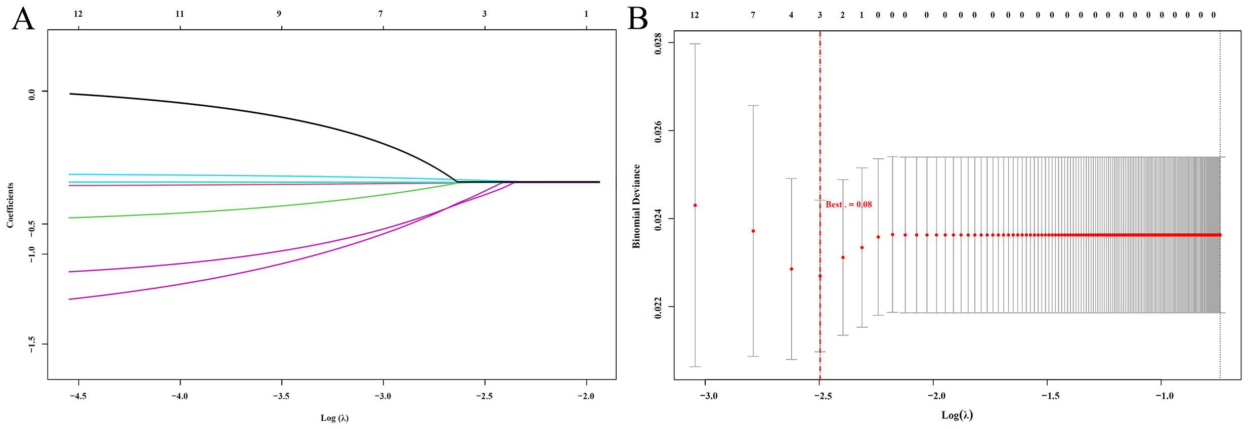 Figure 2. LASSO Regression Analysis (A) LASSO coefficient path plot: Shows how regression coefficients change with Log(λ). As λ increases, more coefficients shrink to zero, indicating variable selection; (B) LASSO cross-validation error plot: Displays the cross-validation error for different Log(λ) values. The red dashed line marks the optimal λ, balancing model complexity and prediction accuracy.