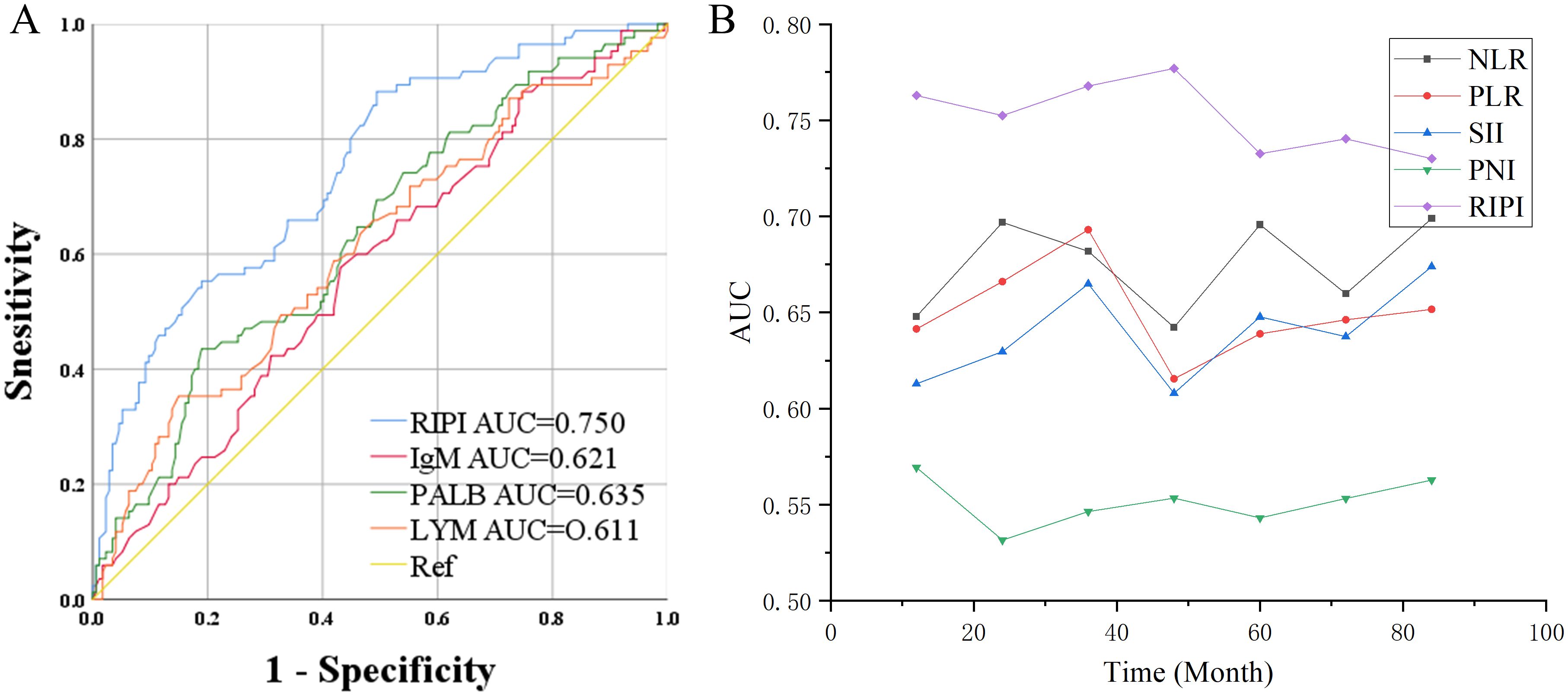 Figure 4. Prognostic value of RIPI. (A) ROC curve of RIPI: RIPI has a higher AUC than its component indicators; (B) Time-ROC of RIPI: RIPI has the highest AUC at all time points.