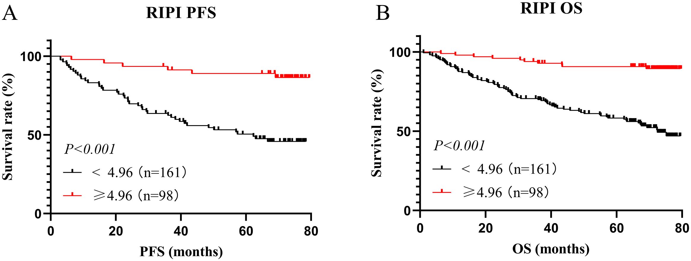 Figure 5. Survival analysis for RIPI. (A) Survival analysis for RIPI of PFS: Patients with RIPI <4.96 have a shorter PFS; (B) Survival analysis for RIPI of OS: Patients with RIPI <4.96 have a shorter OS.