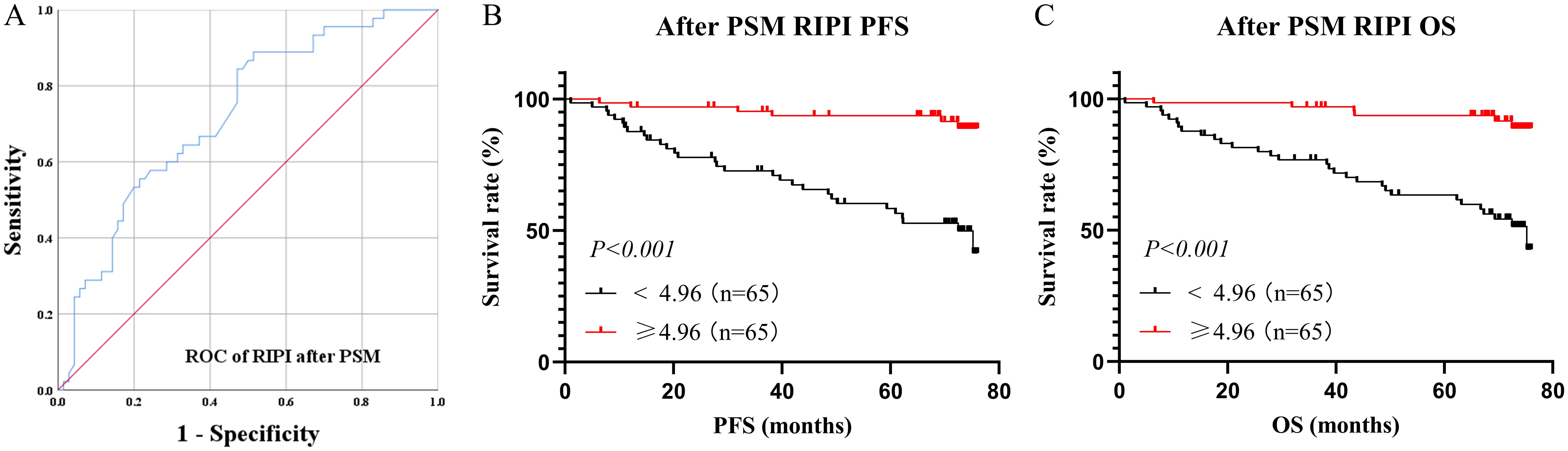 Figure 6. Survival analysis for RIPI after PSM. (A) ROC curve of RIPI after PMS: The AUC of RIPI remains at a high level; (B) Survival analysis for RIPI of PFS: Patients with RIPI <4.96 have a shorter PFS; (C) Survival analysis for RIPI of OS: Patients with RIPI <4.96 have a shorter OS.