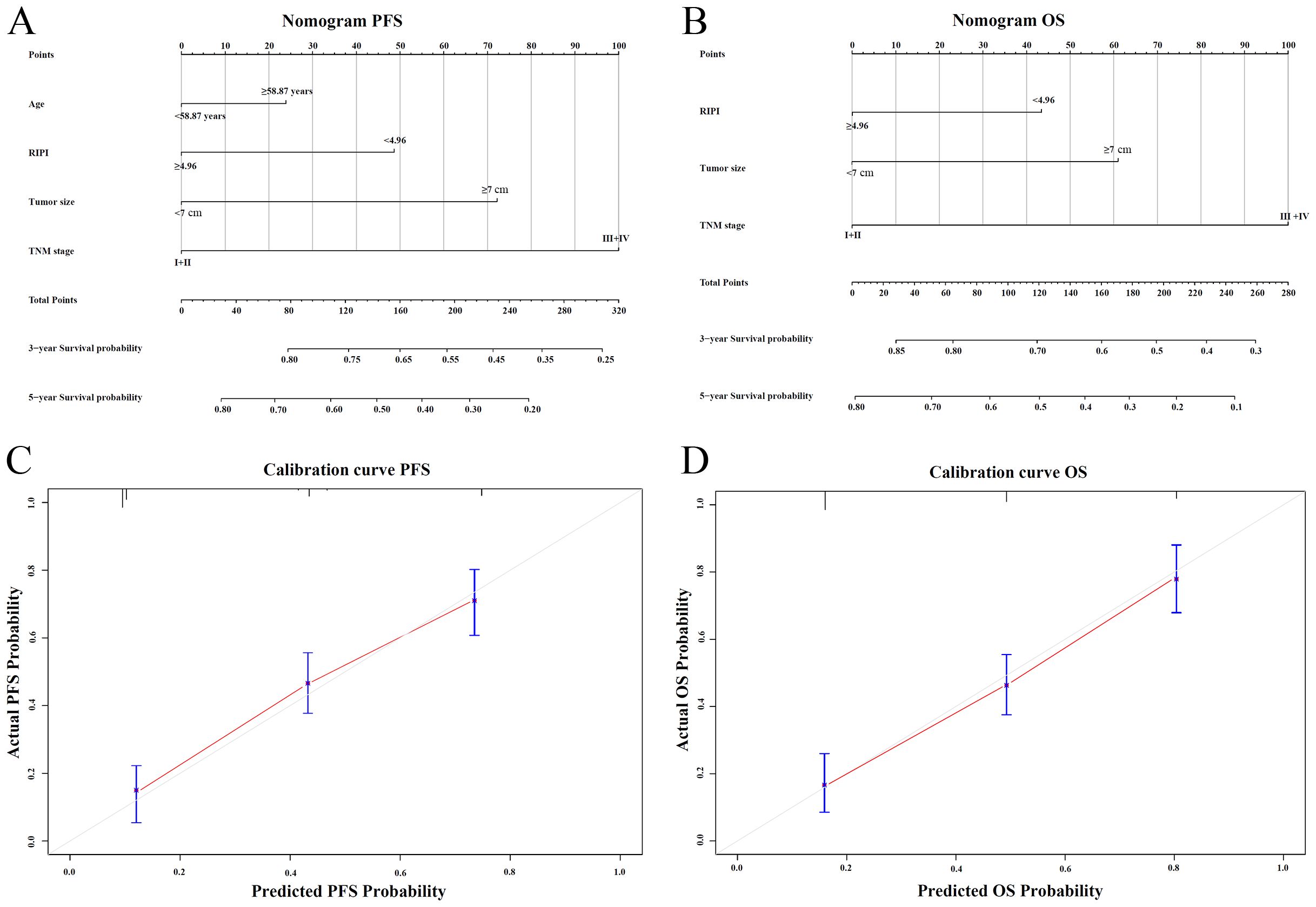 Figure 7. Nomogram and calibration plots for RIPI. (A) Nomogram for predicting 3- and 5-year PFS based on independent prognostic factors; (B) Nomogram for predicting 3- and 5-year OS based on independent prognostic factors; (C) Calibration plot of the nomogram for PFS at 3 and 5 years; (D) Calibration plot of the nomogram for OS at 3 and 5 years.