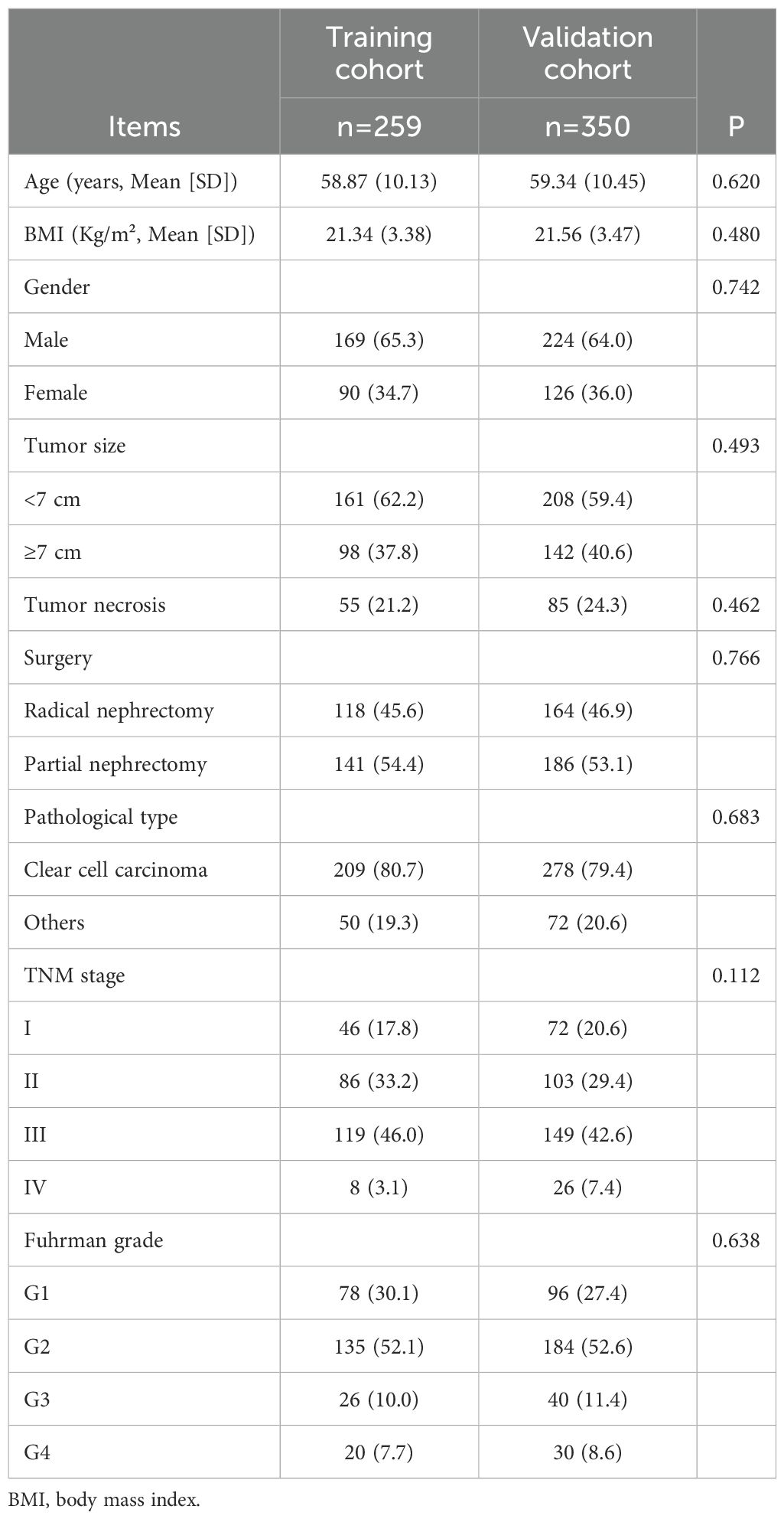 A total of 259 patients were included in the training cohort and 350 in the validation cohort. The mean age was 58.9 years in the training cohort and 59.3 years in the validation cohort. The proportion of male patients was 65.3% and 64.0%, respectively, while the mean BMI was 21.3 and 21.6 kg/m². Based on TNM staging, stage I–III patients comprised the majority in both cohorts. Specifically, in the training cohort, 17.8%, 33.2%, and 46.0% of patients were classified as stage I, II, and III, respectively, while in the validation cohort the corresponding proportions were 20.6%, 29.4%, and 42.6%. Stage IV disease was observed in 3.1% of the training cohort and 7.4% of the validation cohort. No significant differences in clinical or pathological characteristics were observed between the two cohorts (all P > 0.05, Table 2).