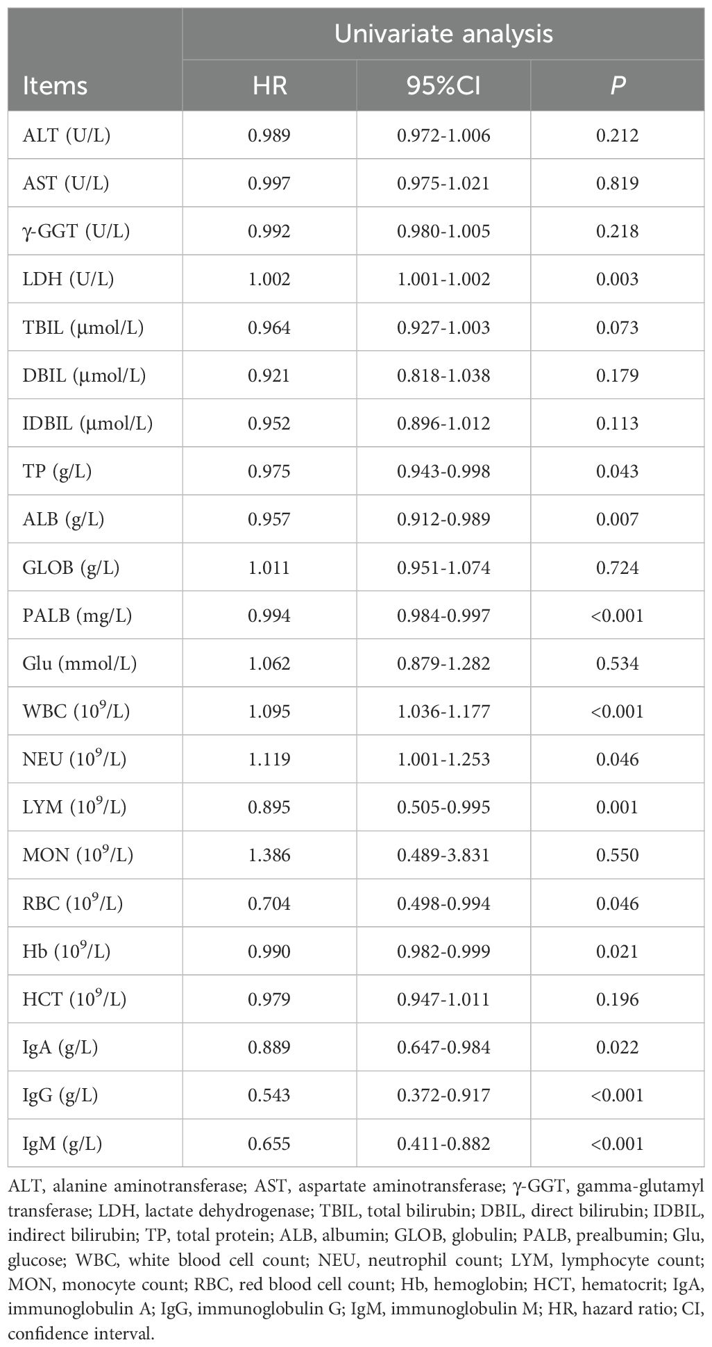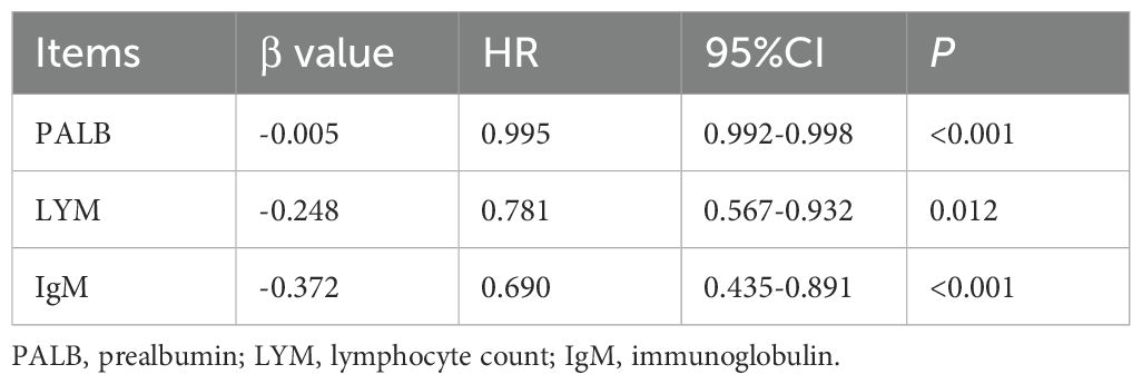 All blood parameters included in the model are shown in Table 3. OS was the primary outcome, and blood parameters were included as continuous variables in the univariate Cox regression model. The results showed that lactate dehydrogenase (LDH), total protein (TP), albumin (ALB), prealbumin (PALB), white blood cell count (WBC), neutrophil count (NEU), lymphocyte count (LYM), red blood cell count (RBC), hemoglobin (Hb), IgA, IgG, and IgM were all potentially associated with OS (all P < 0.05), as detailed in Table 4.