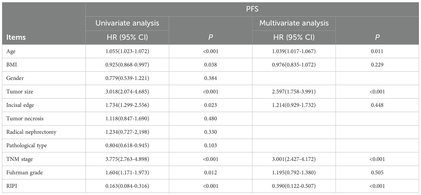 Cox’s analysis showed that age (P<0.001), BMI (P = 0.038), tumor size (P<0.001), incisal edge (P = 0.023), TNM stage (P<0.001), Fuhrman grade (P = 0.012), and RIPI (P<0.001) were associated with patients’ PFS. Further analysis revealed that age (HR = 1.039, P = 0.011), tumor size (HR = 2.597, P<0.001), TNM stage (HR = 3.001, P<0.001), and RIPI (HR = 0.390, P<0.001) were independent prognostic factors for PFS (Table 6).