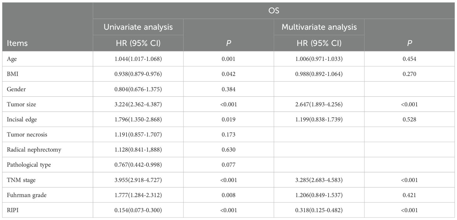 In the analysis of OS, age (P = 0.001), BMI (P = 0.042), tumor size (P<0.001), incisal edge (P = 0.019), TNM stage (P<0.001), Fuhrman grade (P = 0.008), and RIPI (P<0.001) were found to significantly influence OS. Further analysis identified tumor size (HR = 2.647, P<0.001), TNM stage (HR = 3.285, P<0.001), and RIPI (HR = 0.318, P<0.001) as independent prognostic factors for OS (Table 7).