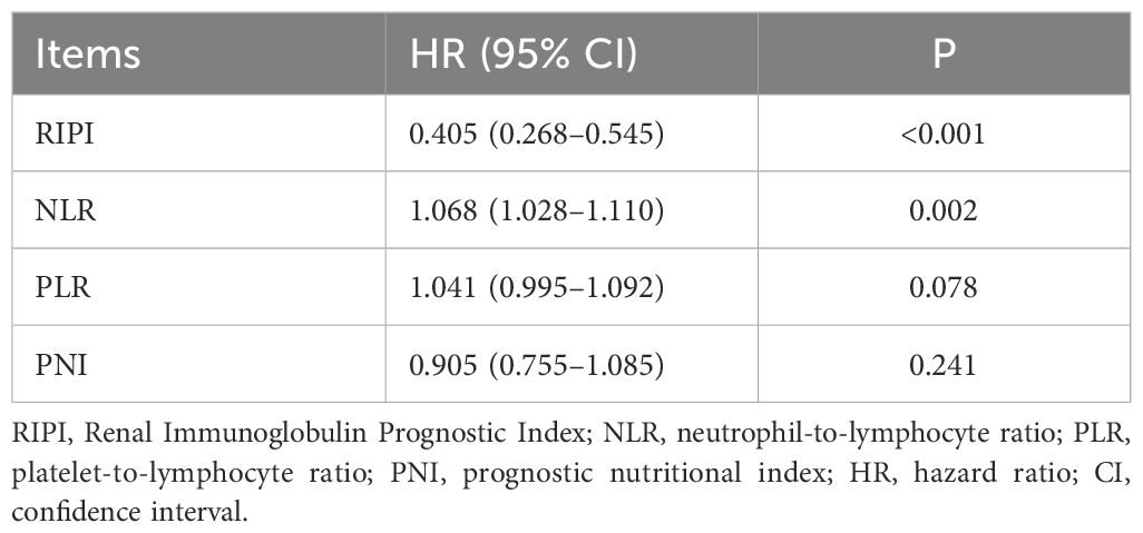 Patient clinical and pathological data were collected through the electronic medical record (EMR) system, while survival data were obtained via routine telephone follow-ups conducted at regular intervals. Patients were followed from the date of surgery until death or the cutoff date of December 31, 2022. The minimum follow-up duration was 60 months, and the maximum reached approximately 80 months. Follow-up assessments were conducted every 3 months during the first 2 postoperative years and every 6 months thereafter. Follow-up data were collected from outpatient medical records, inpatient hospitalization systems, and regular telephone follow-ups. The median follow-up time was 68 months (range: 60–80 months). A total of 41 patients (15.8%) were censored, including those who were lost to follow-up or alive without progression at the end of the study period. Progression-free survival (PFS) was defined as the time from surgery to the first documented disease progression, based on imaging evidence or clinical diagnosis. Overall survival (OS) was defined as the time from surgery to death from any cause. To establish the RIPI, this study collected comprehensive preoperative routine blood test parameters and immunoglobulin levels from patients. Furthermore, to further evaluate the performance of the novel prognostic index, we calculated NLR, PLR, systemic immune-inflammation index (SII), and prognostic nutritional index (PNI), all of which have demonstrated prognostic value in RCC in previous studies. The calculation formulas are provided in Table 1.
