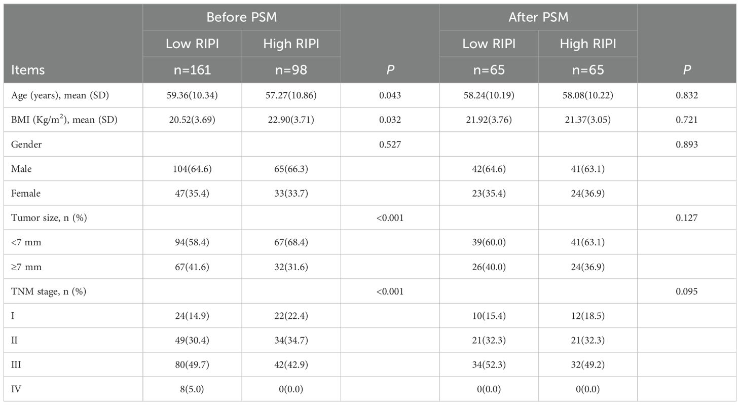 To further eliminate the influence of confounding factors, we performed a PSM analysis of RIPI based on patients’ baseline characteristics and the results from Cox regression analysis. Before PSM, there were 161 patients in the low RIPI group and 98 patients in the high RIPI group. Significant differences were observed between the two groups in terms of age (P = 0.043), BMI (P = 0.032), tumor size (P<0.001), and TNM stage (P<0.001). After matching, each group was reduced to 65 patients, and no significant differences were found between the two groups in terms of any baseline factors (all P>0.05). These results indicate that after PSM, the baseline characteristics between the low and high RIPI groups were better balanced, thereby minimizing potential confounding effects and making the two groups more comparable for further analysis (Table 10).