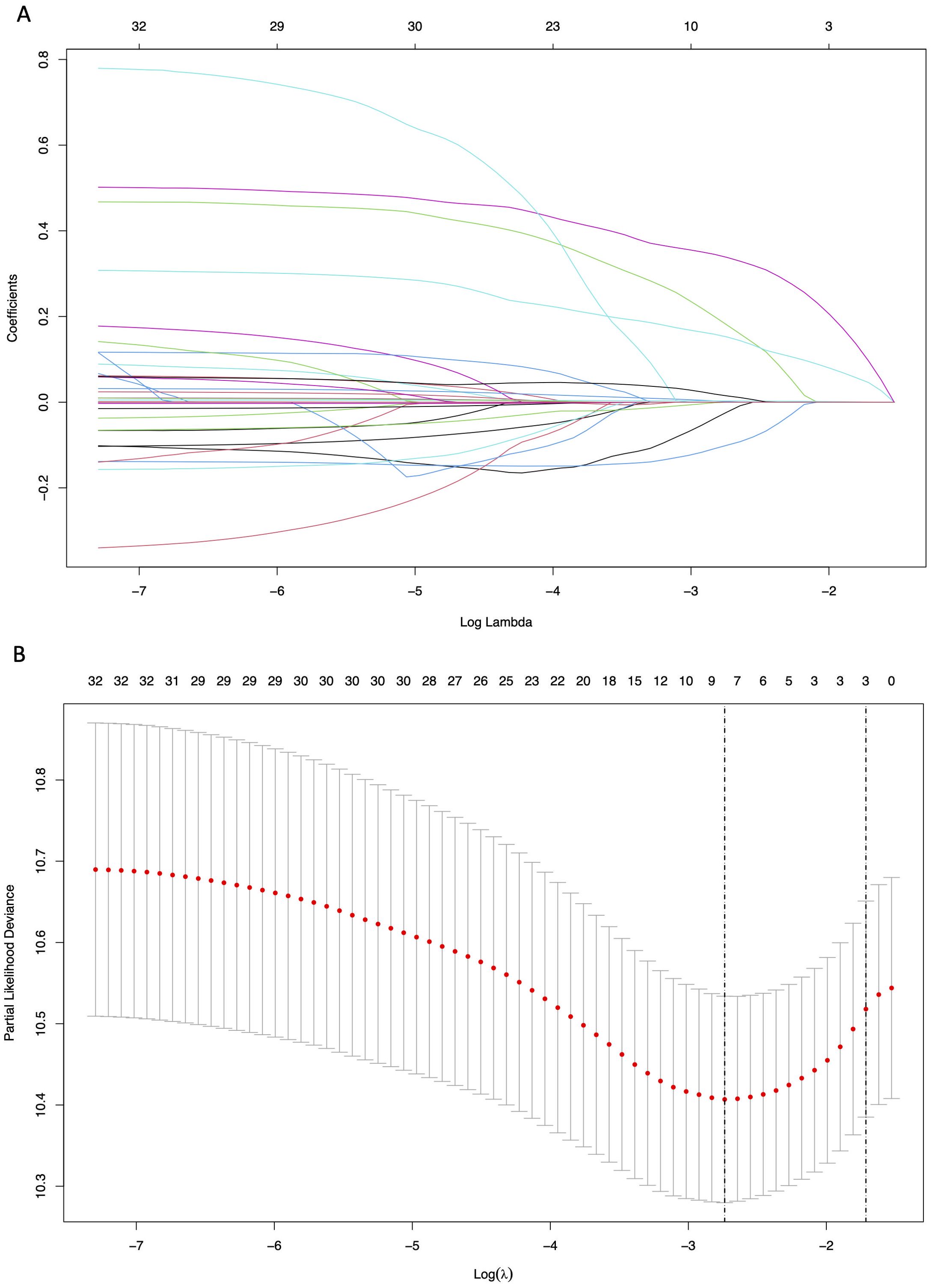 Figure 2. Results of the Lasso regression analysis in the training cohort. (A) The variation characteristics of the coefficient of variables; (B) The selection process of the optimum value of the parameter λ by cross-validation method.