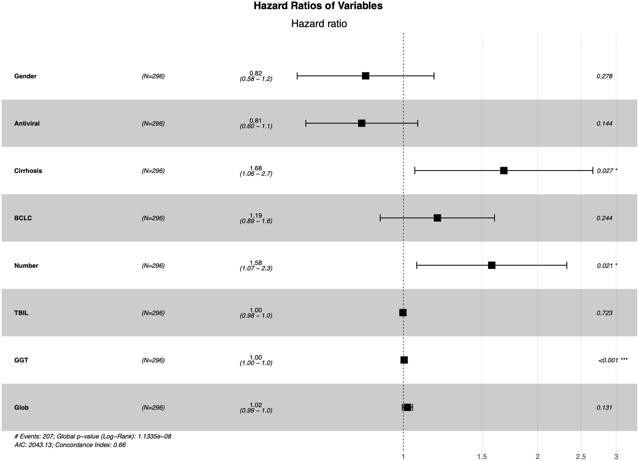 The LASSO regression analysis was used to screen parameters, and the variation characteristics of the coefficient of these variables were shown in Figure 2A. The 10-fold cross-validation method was applied to the iterative analysis, and a model with excellent performance but minimum number of variables was obtained when λ was 0.065 (Log λ = -1.19) (Figure 2B). Eight candidate predictors were identified, including gender, antiviral, cirrhosis, BCLC stage, tumor number, TBIL, GGT and Glob (Figure 3). These predictors were then assessed through multivariate Cox regression, revealing cirrhosis (P = 0.027), multiple tumor (P = 0.021) and GGT (P < 0.001) were independent predictors of RFS.