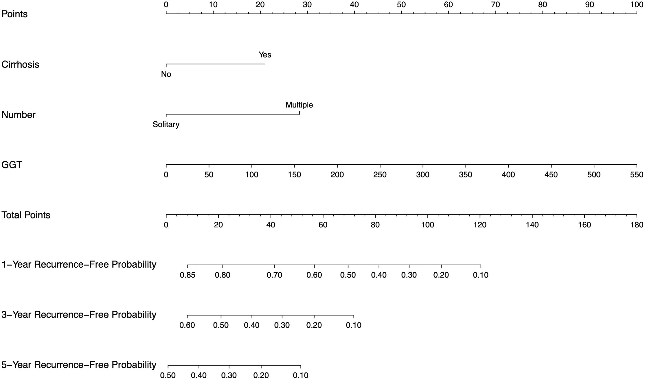 Figure 4. Nomogram, including cirrhosis, tumor number, and GGT for 1-, 3-, and 5-year RFS in HCC patients with high levels of HALP. The nomogram is valued to obtain the probability of 1-, 3-, and 5- years recurrence by adding up the points identified on the points scale for each variable. GGT, γ-glutamyl transpeptidase.